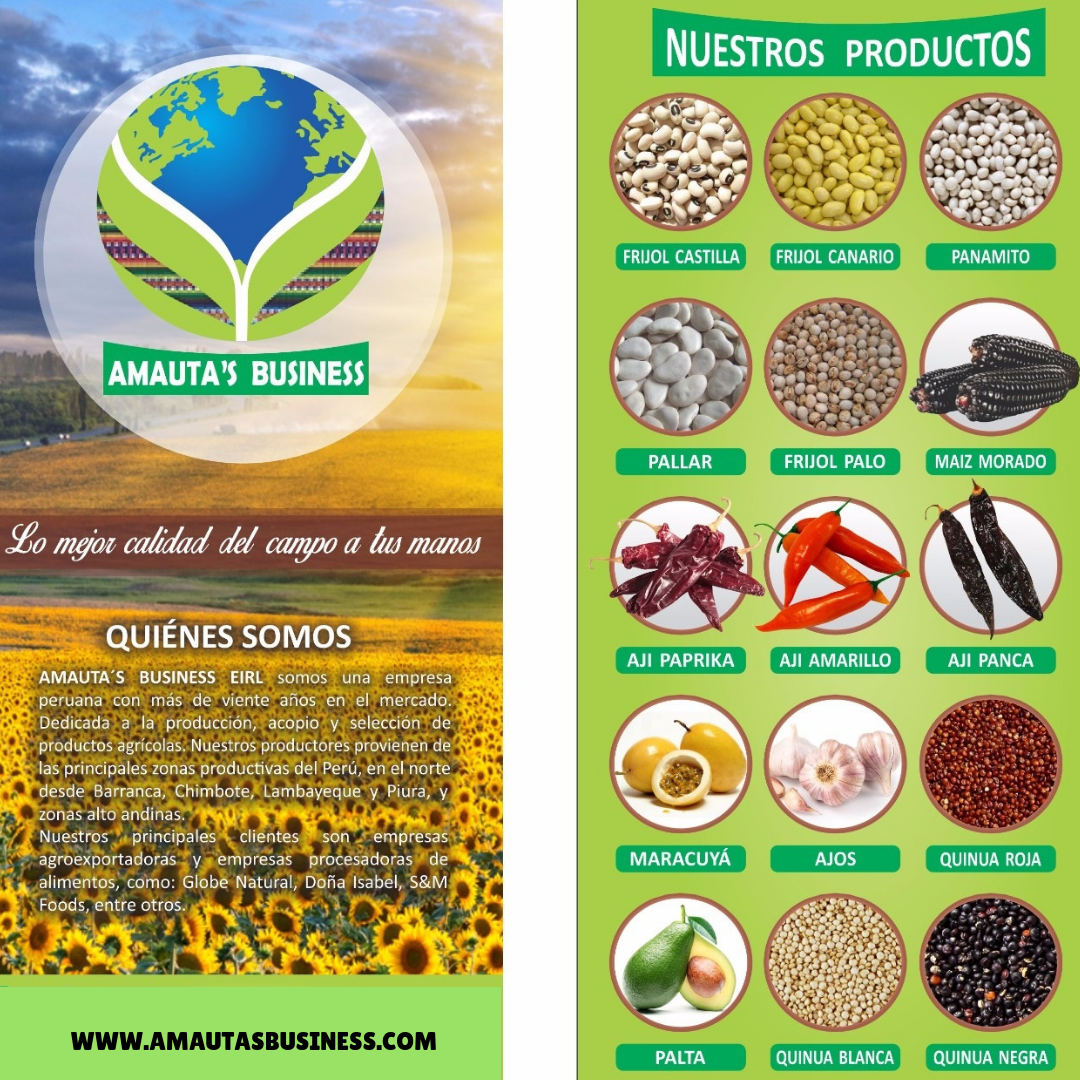 AMAUTA'S BUSINESS EIRL es una empresa peruana dedicada a la producción, acopio y selección de productos agrícolas. Nuestros productos provienen de las principales zonas productivas del Perú, en el norte desde Barranca, Chimbote, Lambayeque y Piura, y zonas alto andinas. Asi mismo, ofrece el servicio de maquila que consiste en la selección y envasado de productos agrícolas provenientes directamente del campo, ofreciendo en todo momento un servicio de acuerdo a las exigencias del mercado nacional e internacional.