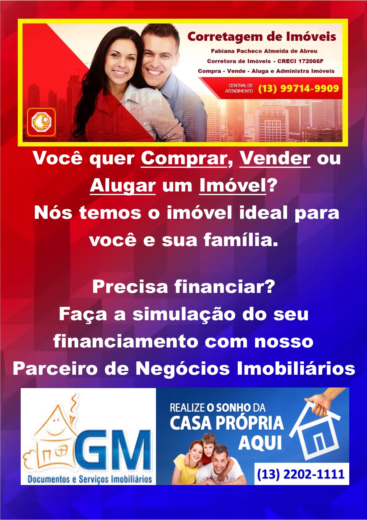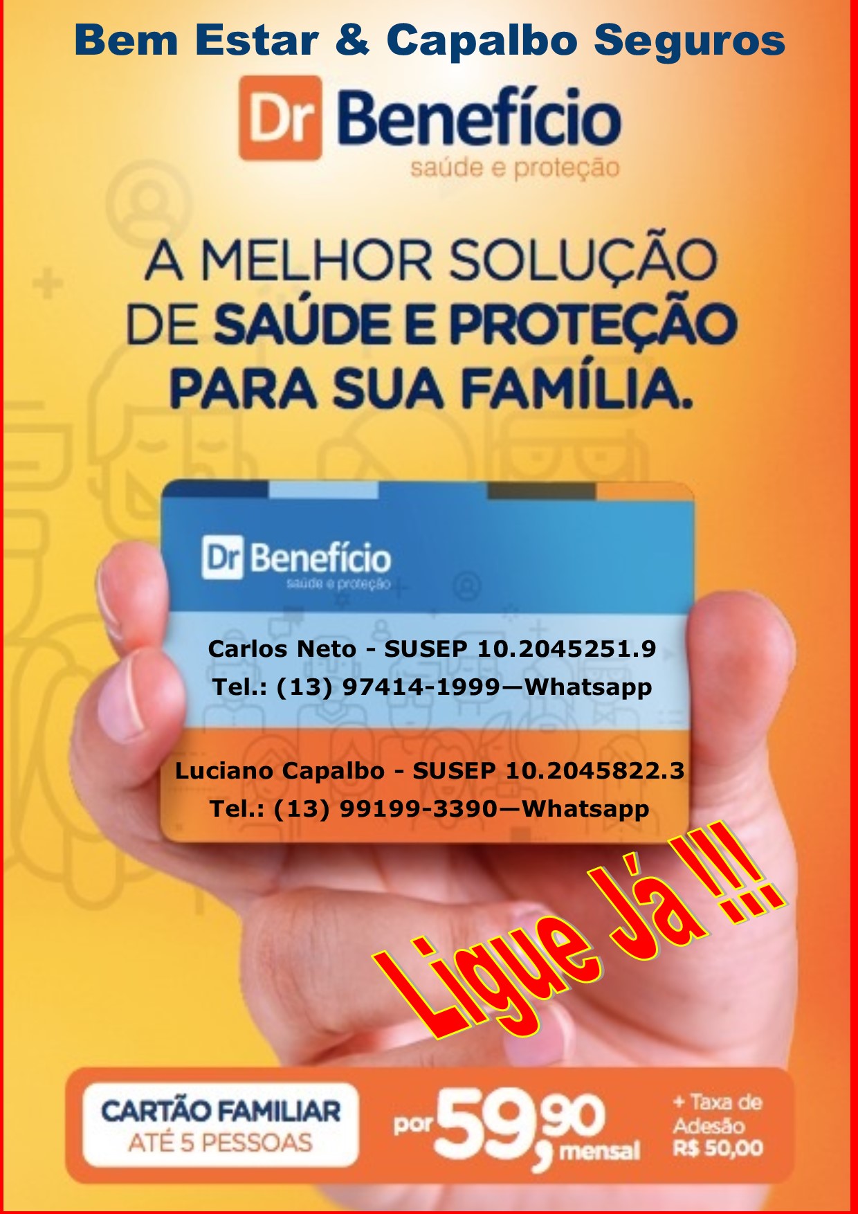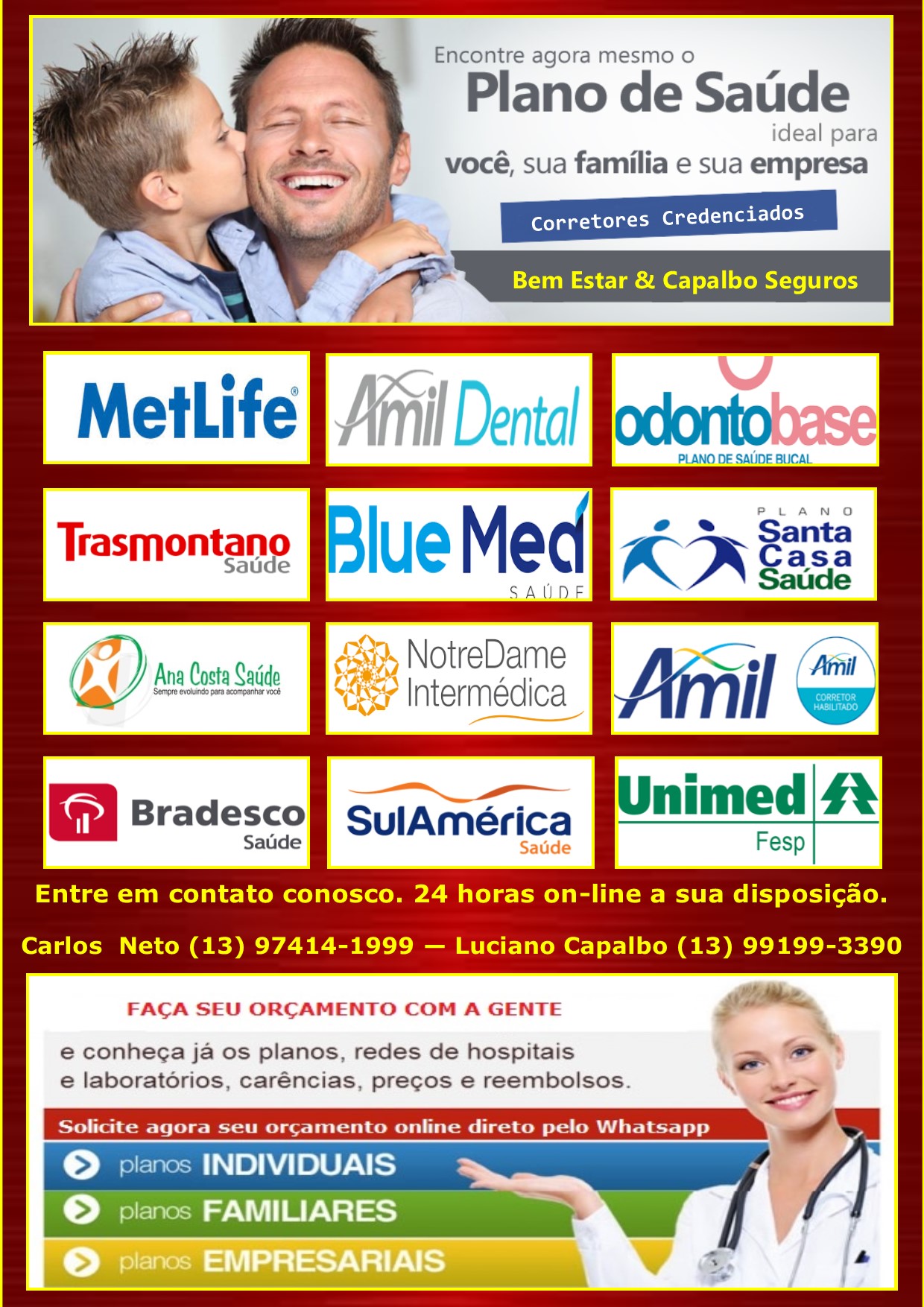 Somos uma Associação de Corretores especializados na consultoria e vendas de planos de saúde e odontológicos (atendimento regional ou nacional), seguros (todos os ramos) e imóveis, com o intuito de oferecer uma diversidade maior de serviços, com qualidade e redução de custos. Trabalhamos com as melhores seguradoras e operadoras do mercado. Atendemos a pessoas físicas e jurídicas e nossa equipe está a sua disposição 24 horas por dia, para oferecer soluções as suas necessidades. Confira nosso portfólio de serviços e valores: - Planos de Saúde e Odontológicos: Individual, Familiar, Empresarial e Adesão Profissional; - Seguros (Todos os Ramos): Saúde, Pessoas, Automóveis, Transportes, Patrimonial, Habitacional, Responsabilidade Civil, Casco, Crédito, Riscos Financeiros, Aeronáutico, Marítimo e Rural; - Imóveis: Compra, Venda, Locação e Administração. Entre em contato conosco. Corretores Associados: - Planos de Saúde e Seguros: Carlos de Abreu Neto - SUSEP 10.2045251.9 Tel.: (13) 97414-1999 - whatsapp Luciano Capalbo - SUSEP 10.2045822.3 Tel.: (13) 99199-3390 - whatsapp Email: bemestar.capalboseguros@gmail.com - Imóveis: Fabiana Pacheco Almeida de Abreu – CRECI 172066 Tel.: (13) 99714-9909 - whatsapp Email: fabianacorretora.bemestar@gmail.com Escritório Central: (13) 3225-5396