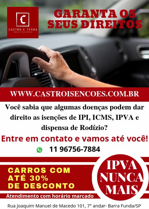 Castro e Terra Isenções Empresa fundada com a missão de acompanhar, auxiliar e facilitar todo o processo de solicitação de isenções, desde o laudo médico até a entrega do carro. Equipe formada por especialistas em direitos de pessoas com necessidades especiais, que nos confere 99% de deferimento nos processos solicitados e amplo conhecimento no mercado automobilístico. Colocando nossa missão em prática, possuímos parcerias diversas para que nossos clientes possam ser atendido com tratamento personalizado de alta perfomance. Nossa empresa sempre está em busca de crescimento, por esse motivo, adotamos o estilo startup de ser, que nos confere agilidade e capacidade de sermos multi, acompanhando de perto as mudanças e tudo o que impacta nosso público. Nossa assessoria é humanizada, exclusiva e personalizada, impossível não atendermos a sua necessidade, pois a sua é também a nossa necessidade.