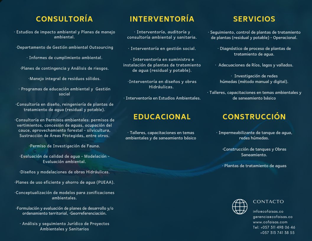 Somos una empresa consultora especializada en el medio ambiente y saneamiento básico, que nace como consecuencia de la creciente demanda e interés que la sociedad del Siglo XXI tiene por el Desarrollo Sostenible, la Conservación de la Naturaleza y una mejor gestión de los Recursos Naturales. Con más de 10 años de experiencia de nuestra gerencia en el sector, contamos con un equipo multidisciplinar y con la colaboración de los excelentes profesionales independientes. Nuestros servicios tienen como objetivo dar soluciones a las necesidades que Entidades Públicas y Privadas como Ingenierías, Consultoras, Laboratorios, Constructoras, Eléctricas, Mineras, etc., tienen en campos tan diversos como el Saneamiento, el Paisaje, la fauna, la Investigación Aplicada , la Conservación de los Espacios Naturales y de las Especies Protegidas, la Evaluación de Impacto Ambiental, los Proyectos de Restauración, los Seguimientos Ambientales en Obra Civil, entre otras actividades.