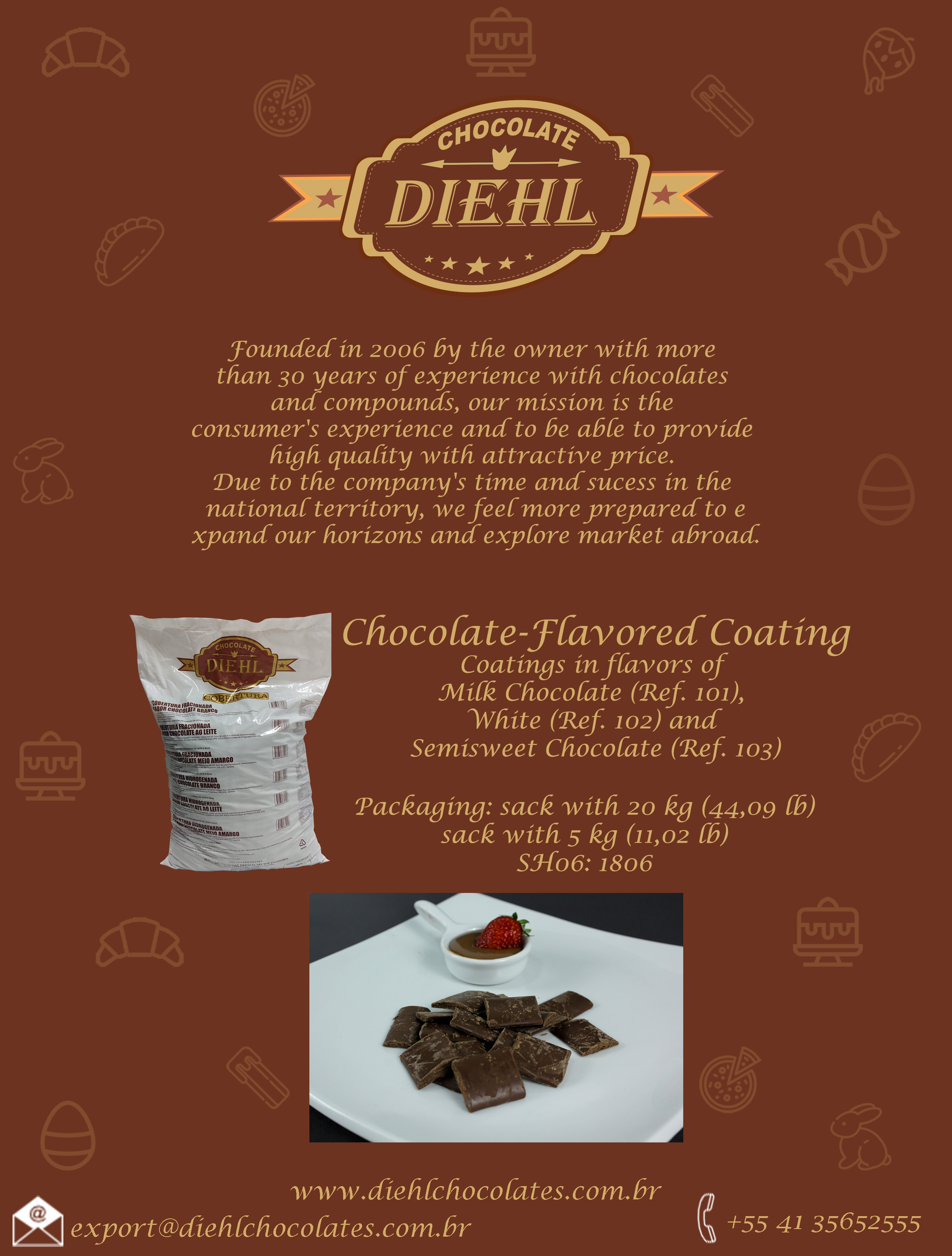 Founded in 2006 by the owner with more than 30 years of experience with chocolates and compounds, our mission is the consumer's experience and to be able to provide high quality with attractive price. Due to the company's time and sucess in the national territory, we feel more prepared to expand our horizons and explore market abroad.