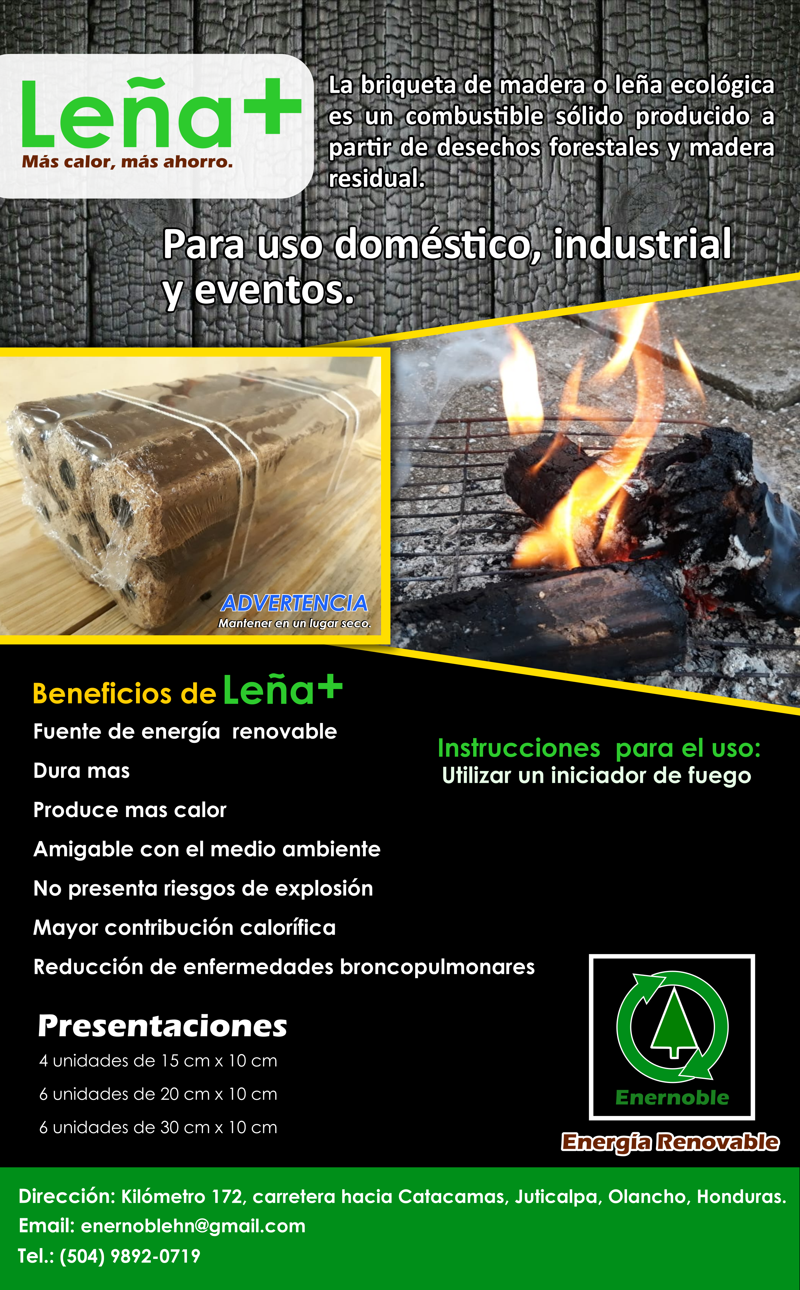 Fabricamos leña ecológica o briquetas para cocción para uso doméstico e industrial. Las fabricamos a partir de desechos forestales o residuos de los aserraderos. Esta leña es ideal para usar en chimeneas, estufas de cocción mejoradas, fogatas, fogones tradicionales, calderas, hornos, etc. Este producto se caracteriza por producir poco humo, poca ceniza, Co2 neutro, ahorro de espacio, alto poder calorífico.