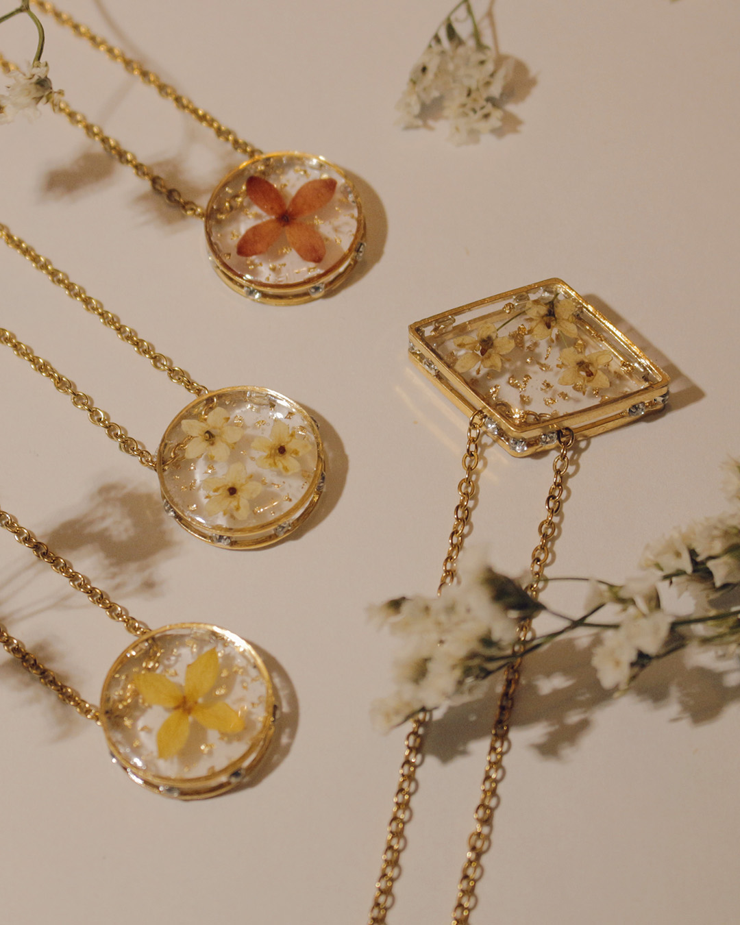 Creamos accesorios (obras de arte en miniatura) a partir del encapsulado de flores y/o colores en resina, que encierran su significado y cuentan una historia.