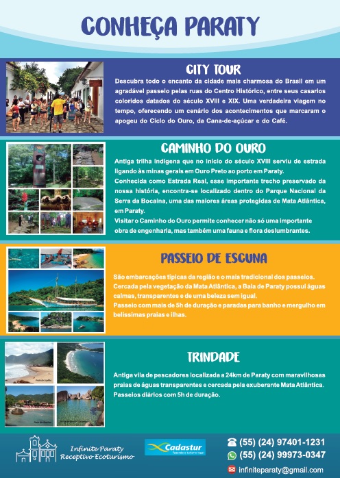 A Infinite Paraty é uma agência de turismo receptivo especializada em ecoturismo, turismo de aventura, turismo histórico-cultural, turismo étnico e turismo pedagógico localizada na cidade histórica de Paraty, em uma das mais belas baías no litoral Sul Fluminense e que se destaca no cenário da chamada Costa Verde. Paraty oferece durante o ano inteiro, uma extensa e rica programação cultural e possui uma excelente infraestrutura hoteleira e restaurantes de nível internacional.