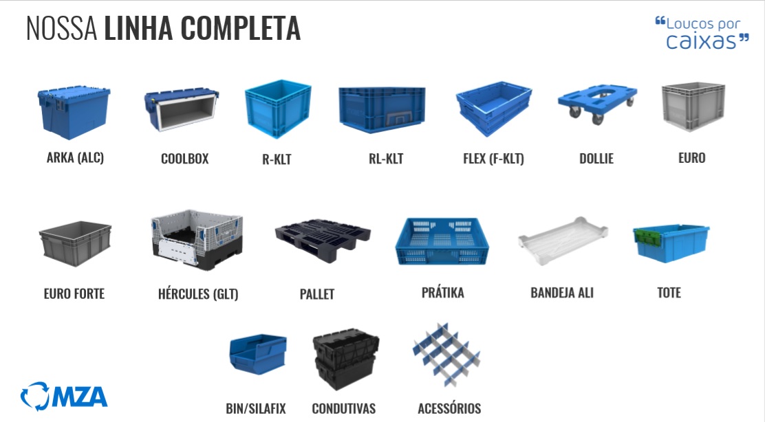 A MZA desenvolve soluções, fabrica, comercializa e fornece caixas plásticas direcionadas para armazenagem, transporte e manuseio de produtos e materiais para as principais indústrias de diversos setores do mercado (automotivo, alimentício, farmacêutico, atacadista, industrial, hospitalar, agropecuário, entre outros).