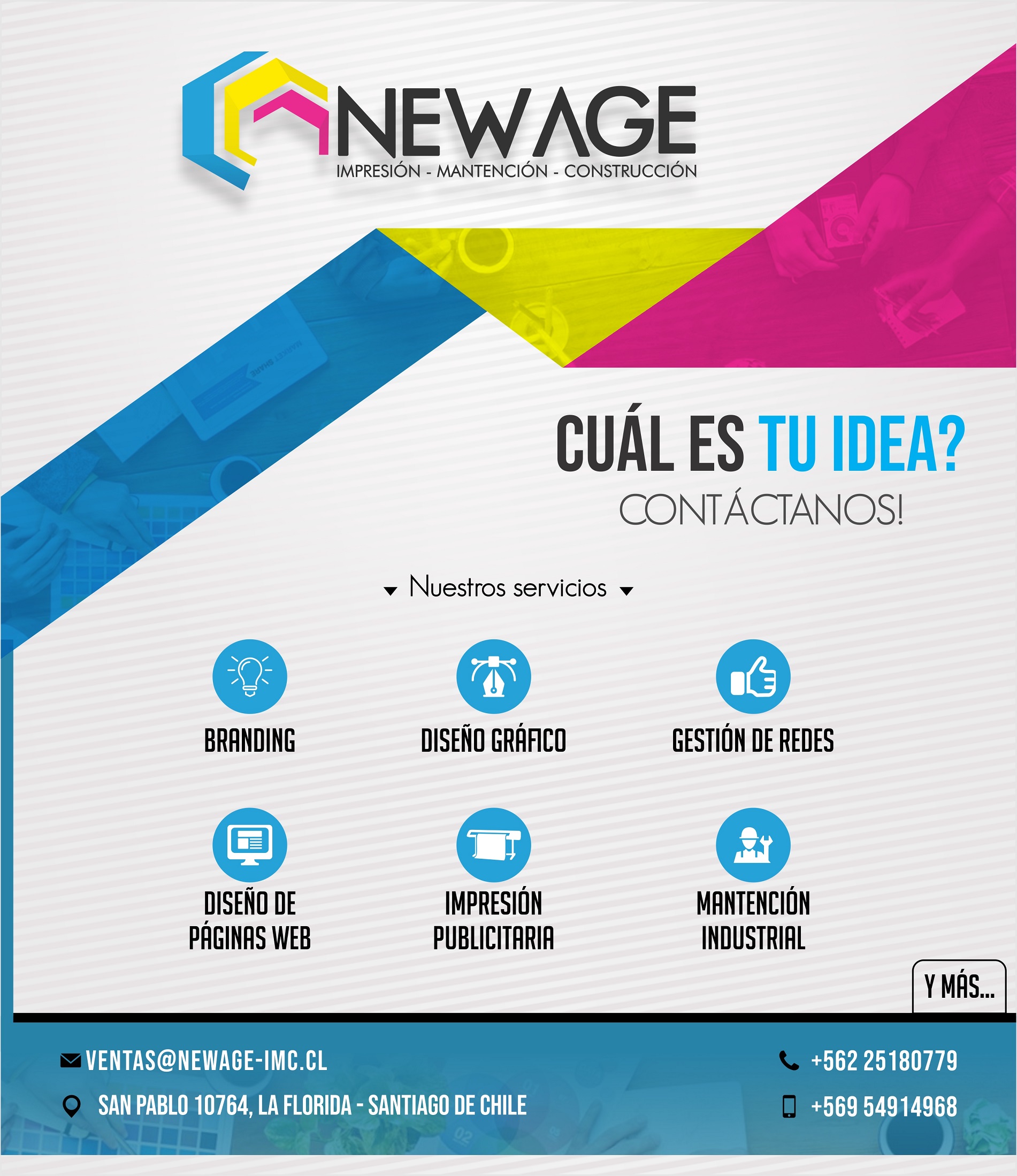 NEW AGE IMC es una empresa especializada en el servicio de impresión Offset Digital, Mantención Industrial y Construcción, con más de 10 años en el mercado. Sumamos nuestro know how de los procesos gráficos e industriales al equipamiento tecnológico de punta para dar una respuesta rápida, precisa y de calidad, impulsando el estilo de nuestro servicio personalizado a los requerimientos específicos de cada uno de nuestros clientes. Con esta visión seguimos construyendo hoy las alianzas estratégicas del futuro. NEW AGE IMC is a company specialized in the Digital Offset, Industrial Maintenance and Construction printing service, with more than 10 years in the market. We add our know-how of graphic and industrial processes to state-of-the-art technological equipment to provide a fast, accurate and quality response, driving the style of our personalized service to the specific requirements of each of our clients. With this vision we continue to build the strategic alliances of the future today.