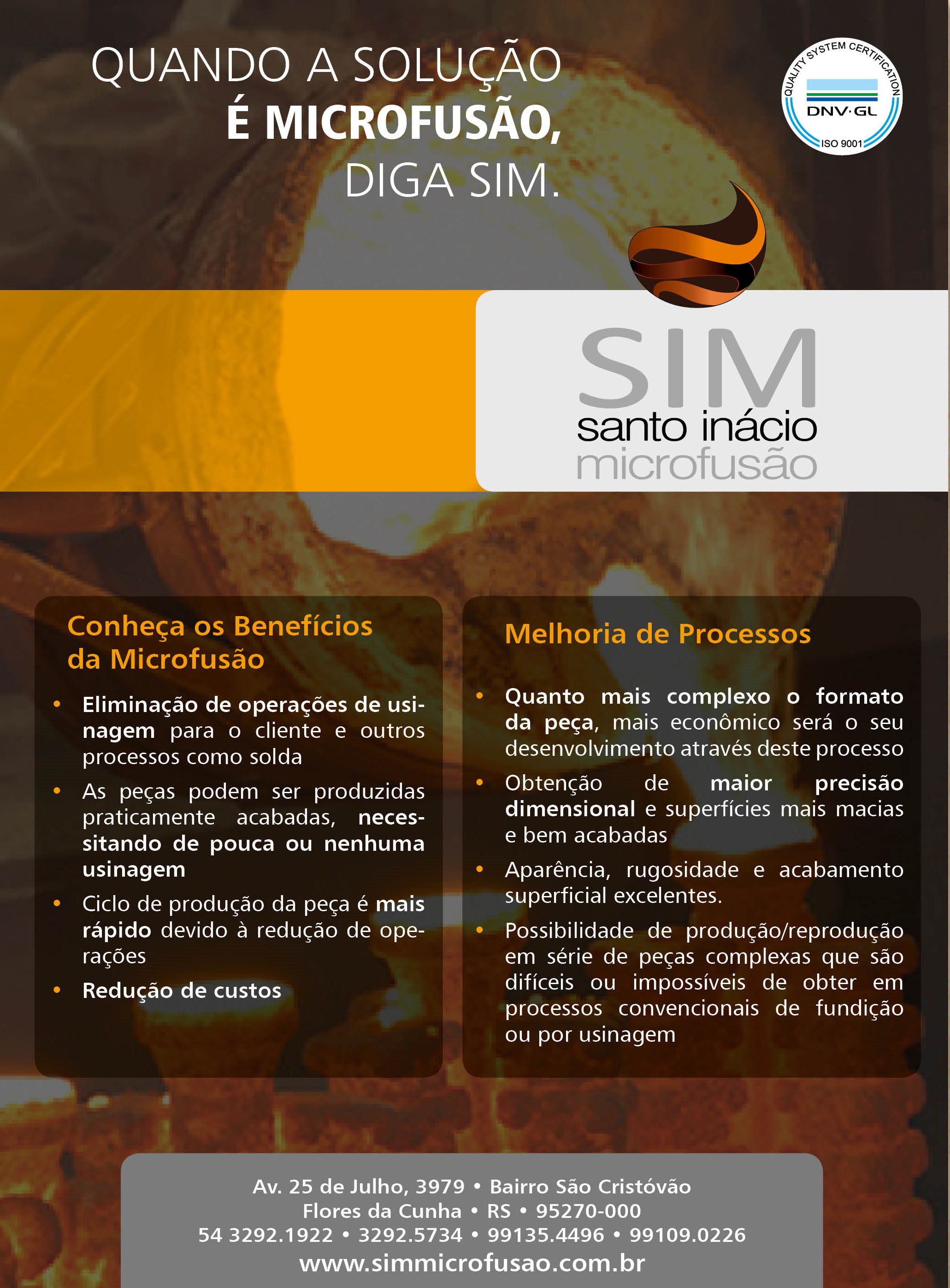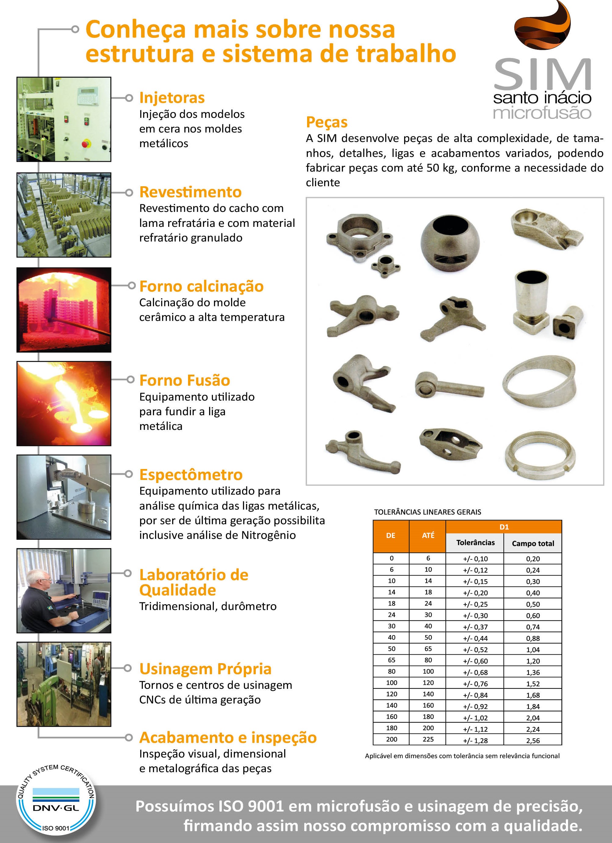 A SANTO INÁCIO MICROFUSÃO, FUNDIÇÃO DE PRECISÃO (investiment casting) através da fabricação de peças em aço pelo processo de cera perdida. Empresa genuinamente brasileira e com conhecimento de mercado de exportação. Desenvolvemos peças, conforme a necessidade do cliente, em mais de 300 tipos de liga com qualidade e comprometimento com data de entrega, e despachamos para mais de 100 países. Fornecemos aços INOX (SÉRIE 300 e 400), aços carbonos, baixa, média e alta liga, aços ferramentas e aços especiais base níquel e cobalto. Fornecemos peças BRUTAS DE FUSÃO, USINADA , TRATADAS TERMICAMENTE (normalização, tempera , recozimento e cementação e outros especiais) e COM DIVERSOS ACABAMENTOS SUPERFICIAIS (zincagem, cromagem, pintura e outros) e MONTAMOS CONJUNTOS (dobradiças, suportes e sistemas especiais).