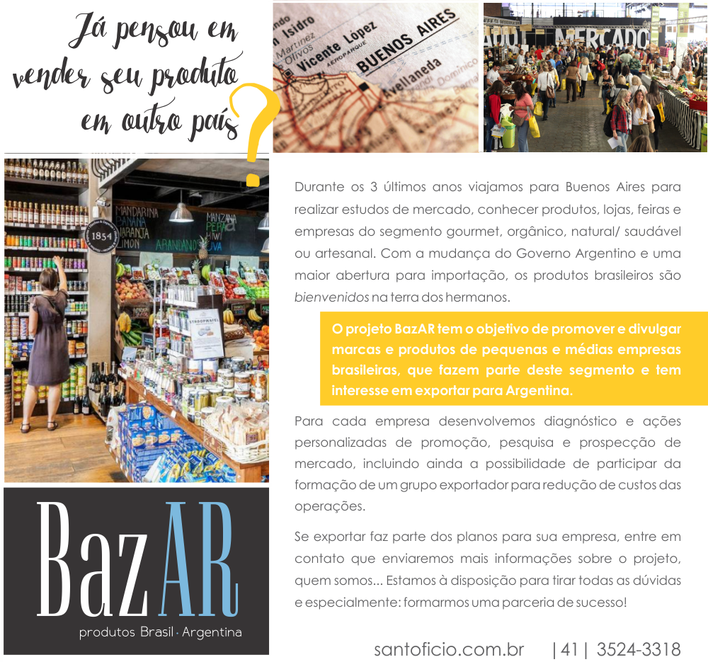 Há mais de 20 anos atuando na área de comunicação, marketing e design a Santofício desde 2016 assessora empresas que desejam exportar - ou já exportam - e desenvolve projetos e ações personalizadas para promoção internacional, destacando adequação de embalagens, rótulos, manuais e outros; desenvolvimento de materiais técnicos e de divulgação impressos e digitais; traduções (Espanhol - Inglês - Português), desenvolvimento de sites e outros produtos digitais. Algumas ações são específicas somente para a ÁREA DE ALIMENTOS: - Missões prospectivas para visitas a feiras internacionais. - Prospecção internacional e abertura de mercado. - Demonstração de produtos. - Pesquisa de mercado, produtos e tendências. - Ações colaborativas em feiras com repasse individual ao empresário.
