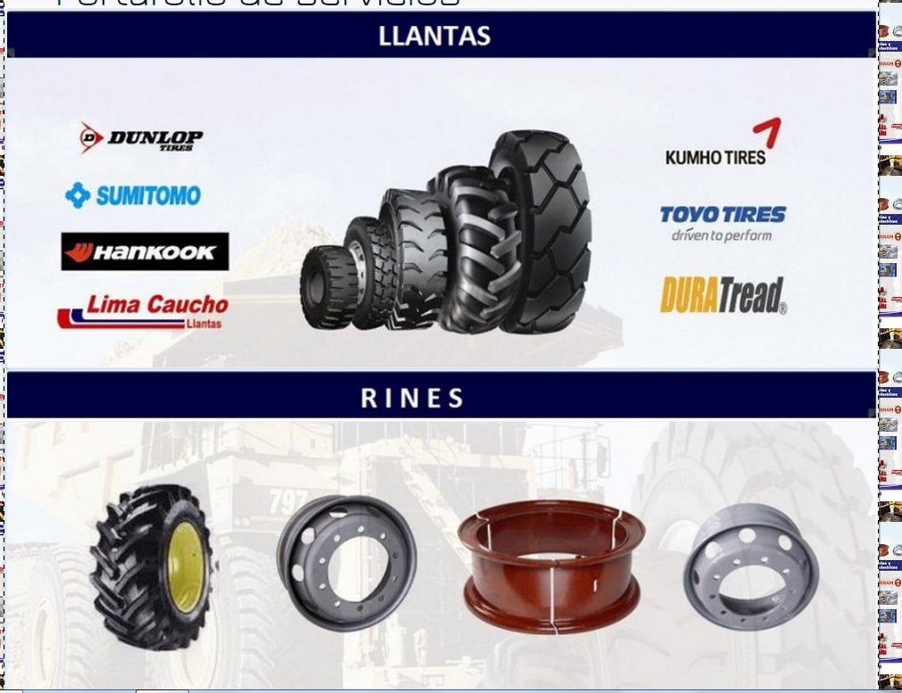 una firma comercializadora ubicada en Barranquilla Colombia, que suministra productos de caucho (llantas de equipos livianos, pesados, industriales, agrícolas, OTR; neumáticos, protectores, correas, bujes) y repuestos para vehículos (suspensión, motor, frenos, partes eléctricas, aire acondicionado, muelles, sellos hidráulicos) para la industria minera, transporte, construcción, agrícola y manufactura. Nuestro compromiso es brindar Calidad y Servicio al mejor precio del mercado COMERCIALIZADOR DE LLANTAS EQUIPO LIVIANO, PESADO, OTR, MONTACARGAS, OBRAS CIVILES, PORTUARIO, AGRICOLA GENERAL, CONTINENTAL, DUNLOP, SUMITOMO, BKT, GOODYEAR, MICHELIN IMPORTADOR DE MARCAS TOYO- HANKOOK- HANKSUGI- LIMA CAUCHO – KUMHO - DURATREAD NEUMATICOS NACIONAL E IMPORTADOS. RUBBERMIX - CHALLERGER RINES PARA CAMIONES, EQUIPOS INDUSTRIALES Y OBRAS CIVILES /MINERAS COFRE, HANKSUGI, NACIONALES DISTRIBUIDOR DE SELLOS HIDRAULICOS Y NEUMATICOS HERCULES HERRAMIENTAS E INSUMOS PARA REPARACION DE LLANTAS THECH INTERNATIONAL REPUESTOS Y PARTES ELÉCTRICAS AUTOMOTRICES, EQUIPO LIVIANO, INDUSTRIAL Y PESADO, ALTERNADORES, MOTORES DE ARRANQUE, BOMBILLERÌA, CABLES, BOBINAS, STOPS, LUCES, ETC DELCO REMY, BOSCH, KTC, HELLA, AUTOPAL, NARVA, OSRAM, ZEM, WAI, POLLAK, TORICA, FLOSSER, VEETHREE, Y OTRAS MUELLES EQUIPO LIVIANO Y PESADO HERCULES – IMAL BATERIAS AUTO, CAMIONETA, CAMION, EQUIPOS ESTACIONARIOS , MARINOS, FERROVIARIOS, CARGADORES Y ARRANCADORES WILLARD, MAC, VARTA, SHUMACHER, INCAR.. ACEITES, GRASAS, HIDRAULICO Y DERIVADOS GULF, GS OIL, CRC, LOCTITE, WD-40, SINTECO, ETC FILTRACIÓN ALTA CALIDAD PARA EQUIPO PESADO, AIRE, COMBUSTIBLE, REFRIGERANTE Y FLUIDO HYDRÁULICO BALDWIN FILTERS ELEMENTOS DE SEGURIDAD AUTOMOTRIZ: ANTENAS, RESORTES, BANDERINES, LUCES, BALIZAS, ETC GECKO ELEMENTOS DE SEGURIDAD INDUSTRIAL. BOTAS EN PVC, GAFAS, CASCOS, GUANTES, ARNES, IMPERMEABLES, CHALECOS. HERRAMIENTAS MANUALES Y ELECTRICAS, TALADROS, PULIDORAS, HOJAS DE SIERRA, DISCOS DE CORTE, DESBASTE, BROCAS, HOJAS DE LIJAR, HOJAS DE SIERRA, BANCOS DE TRABAJO. ETC STANLEY, METABO, DEWALT, BOSCH, STARRET. MATERIALES ELECTRICOS EN GENERAL, SEGURIDAD INDUSTRIAL, TABLEROS DE CONTROL, AUTOMATIZACIÓN INDUSTRIAL, REDES Y COMUNICACIÓN, CABLEADO ESTRUCTURADO, FIBRA OPTICA Y EQUIPOS ACTIVO