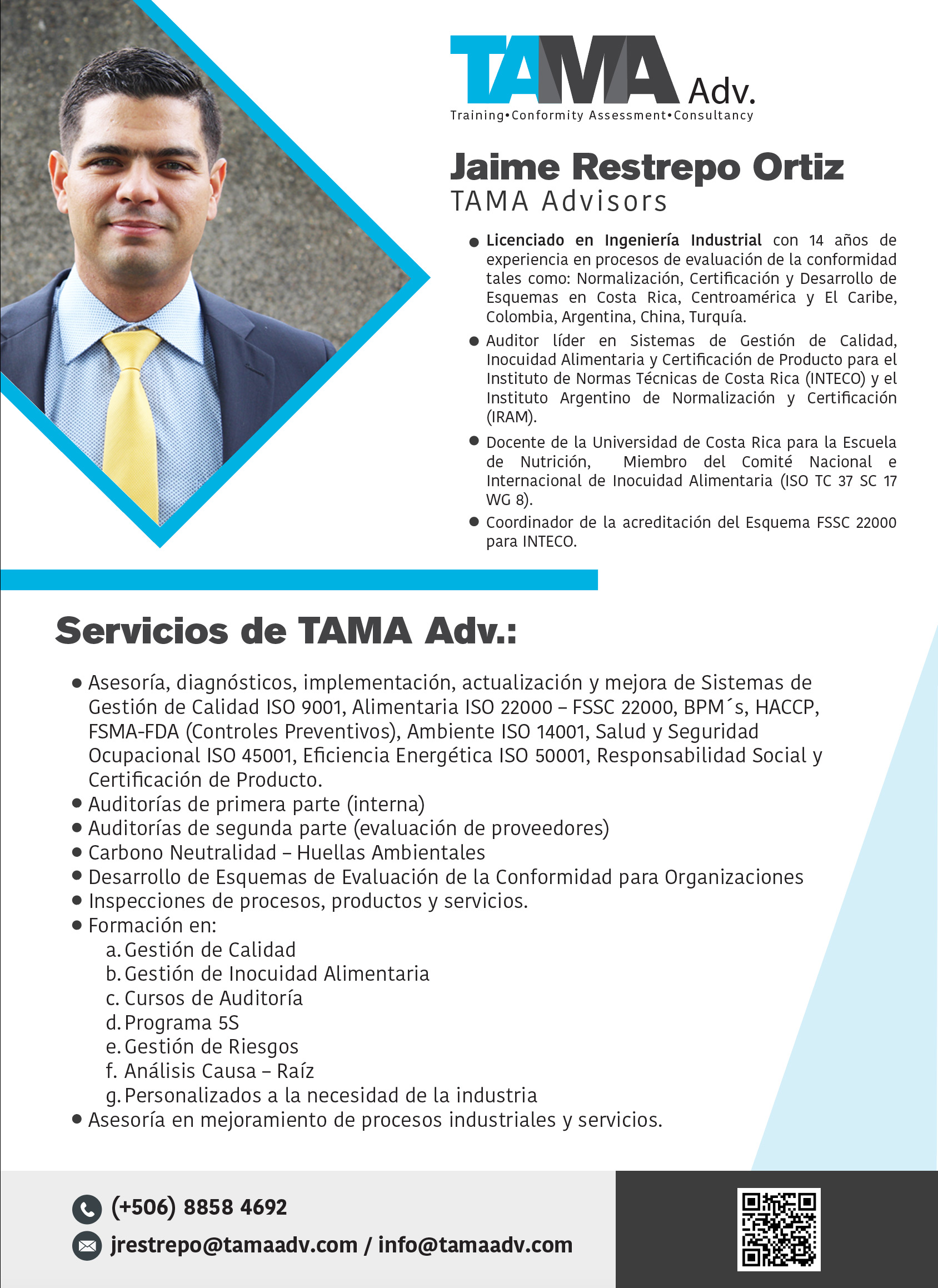 Consulting, Training and Conformity Assessment in different Management Systems like ISO 9001, ISO 14001, ISO 22000, FSSC 22000, GMP, Footprint and quantification GHG.