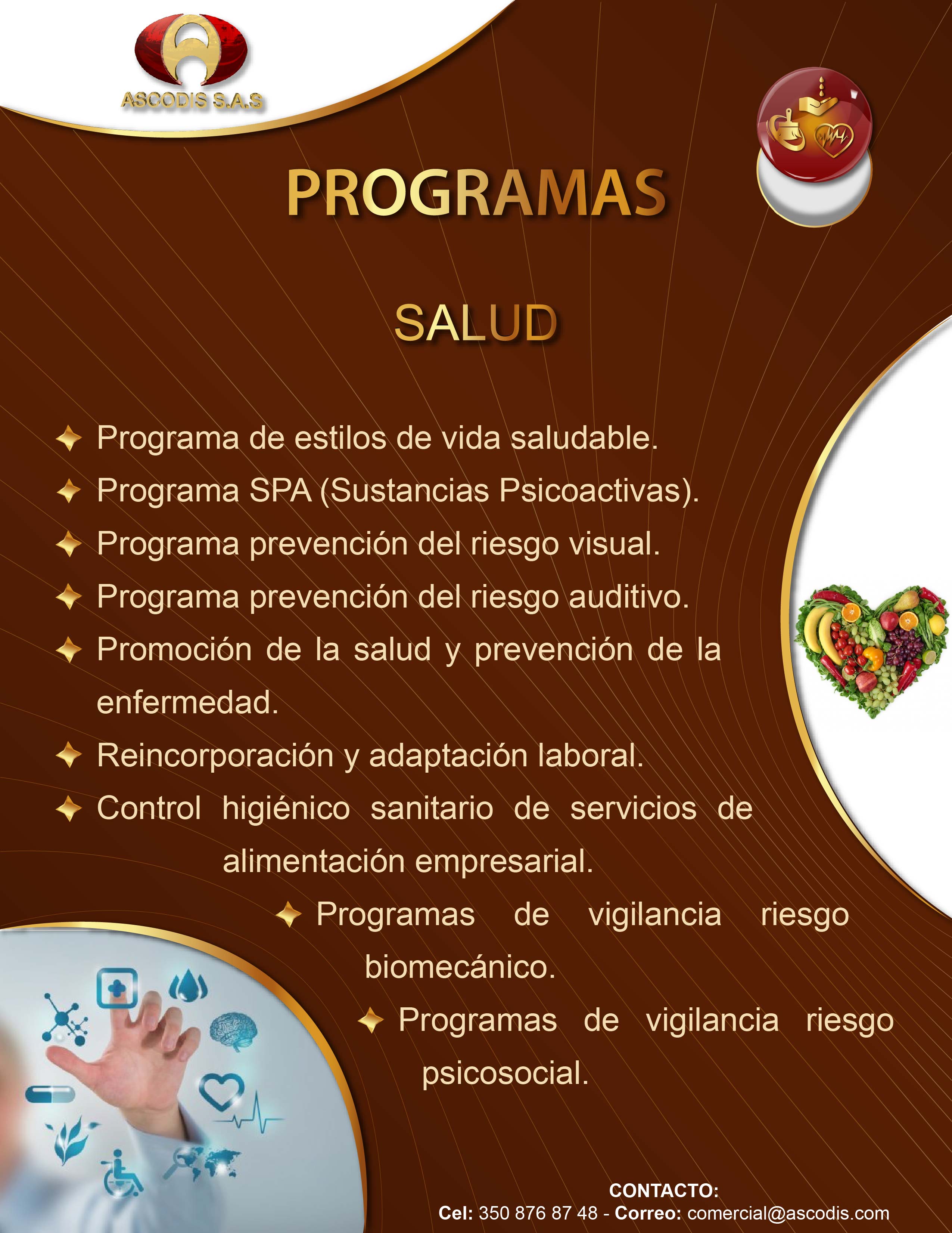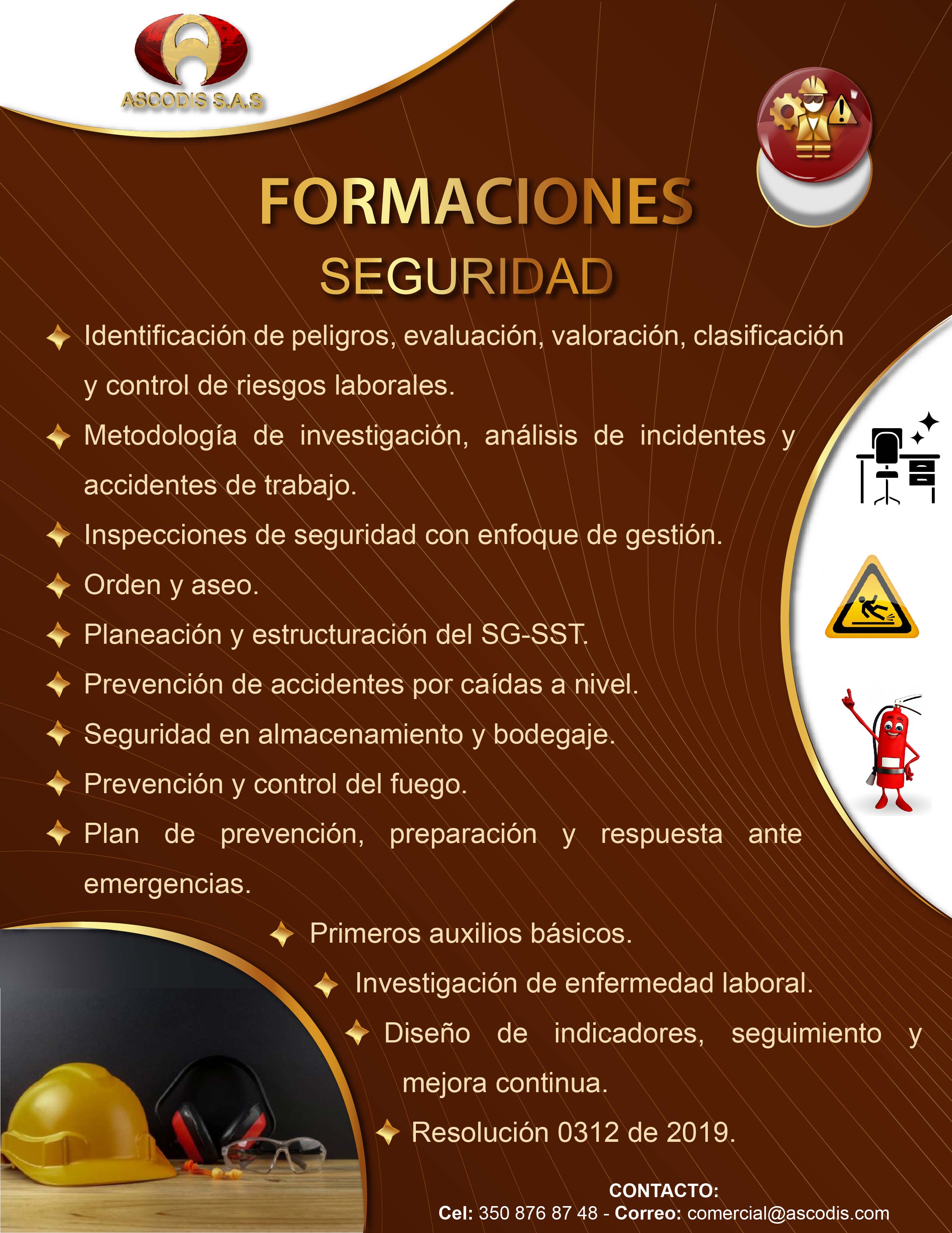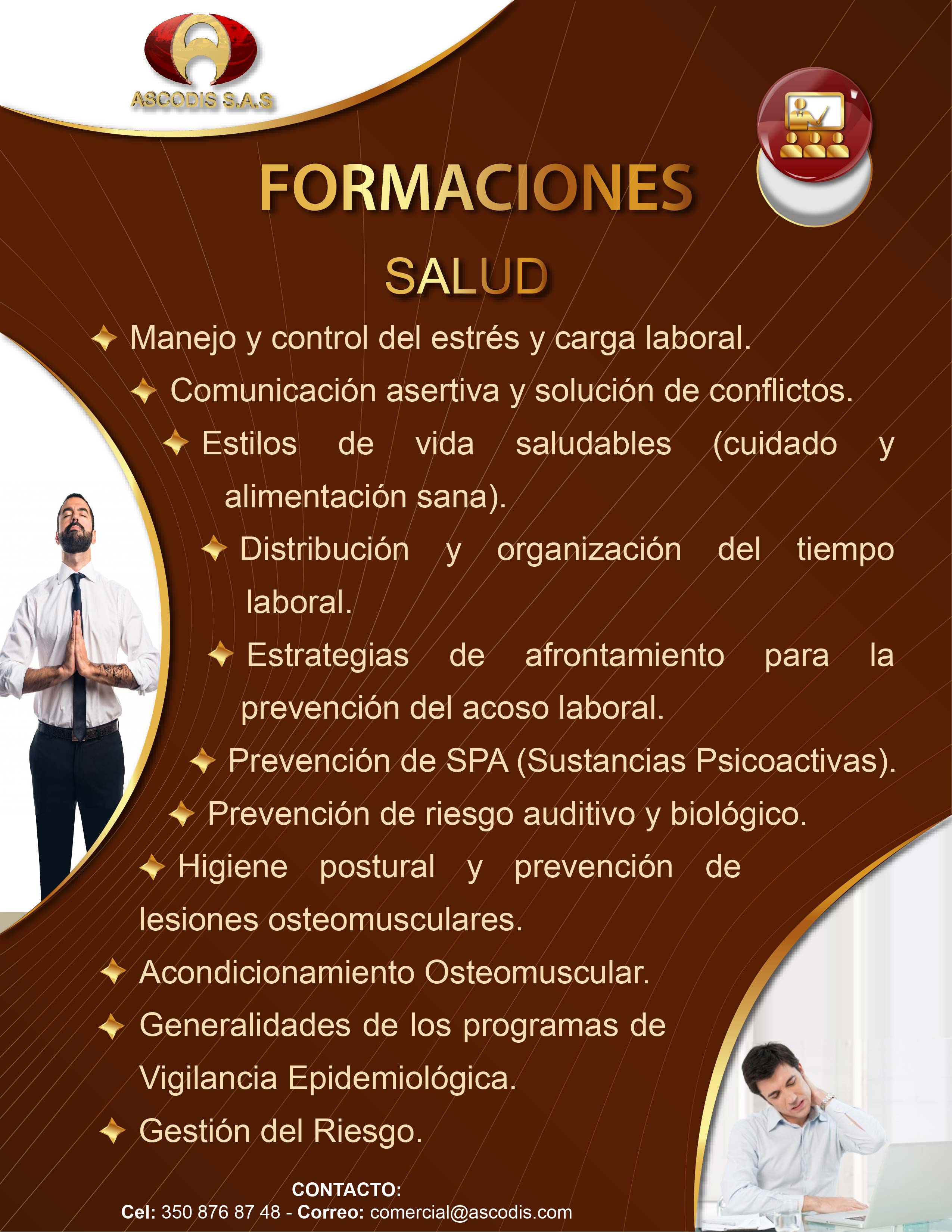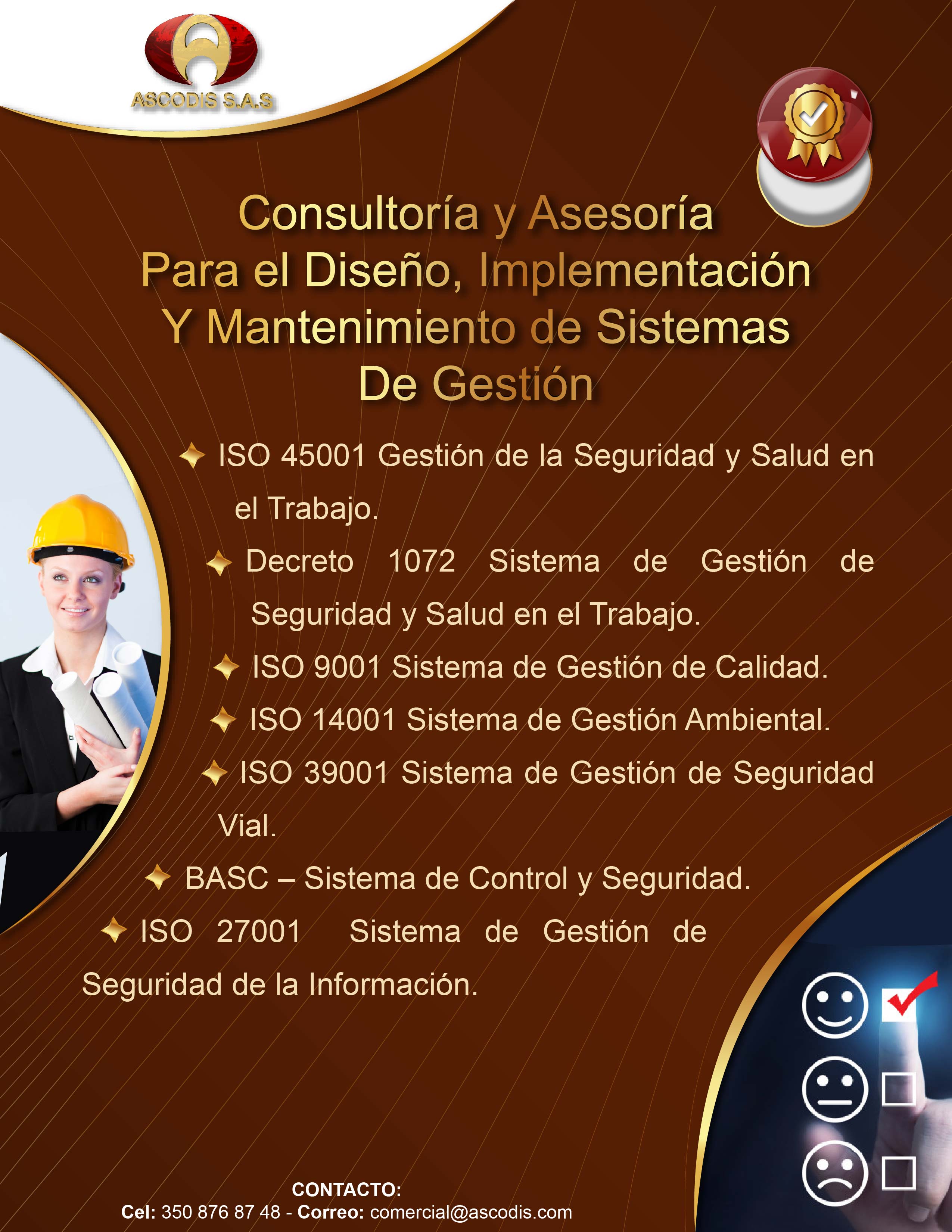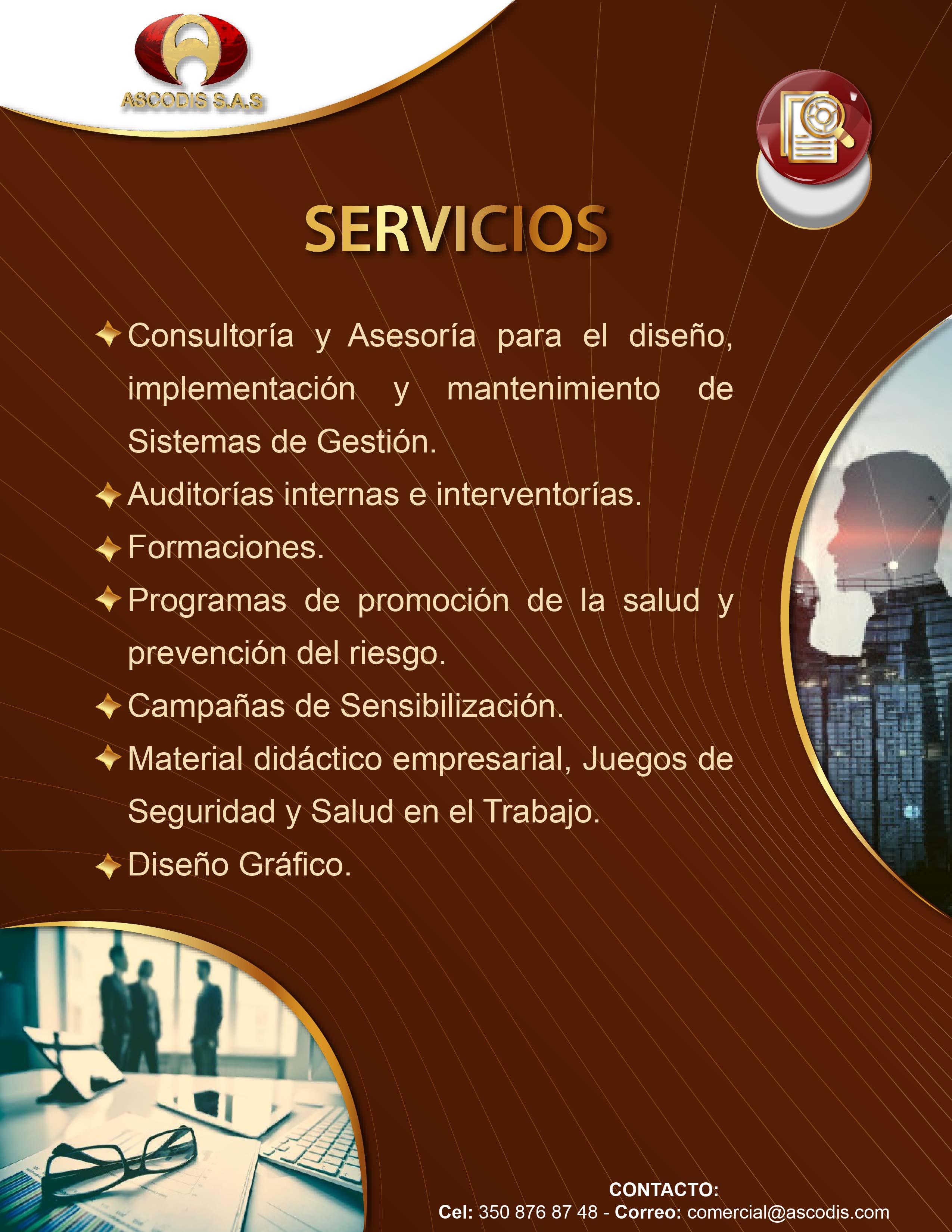 Ascodis S.A.S es una empresa que presta servicios de Consultoría, Asesoría, Auditoria, Formación, Diseño Gráfico e interventoría en Sistemas de Gestión de Seguridad y Salud en el Trabajo, Protocolos de Bioseguridad, Seguridad Vial, Calidad, Medio Ambiente, BASC, Gestión de Riesgo, Responsabilidad Social, Continuidad de Negocio y Seguridad de la Información, en el sector Publico y Privado a nivel Nacional.