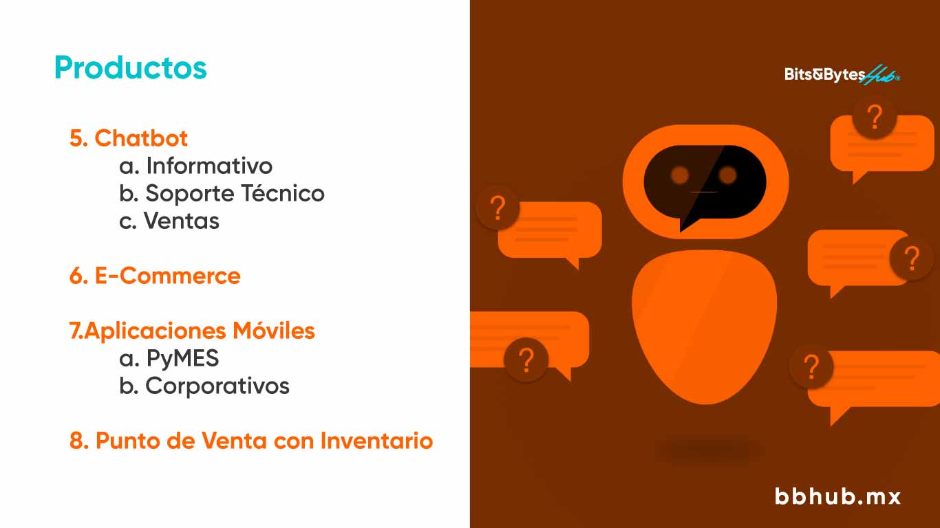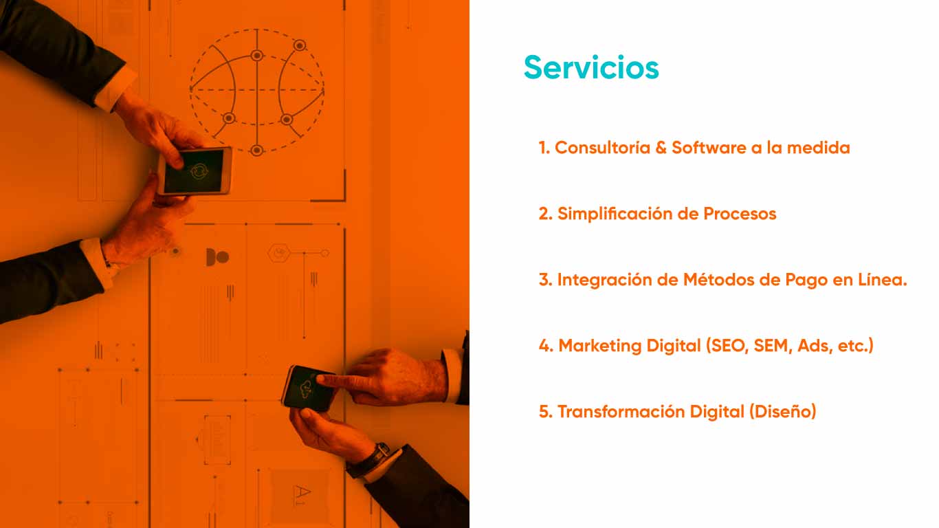 1) Aplicaciones Móviles 2) IA, Chatbots & RPA 3) Consultoría & Desarrollo de Software a la Medida
