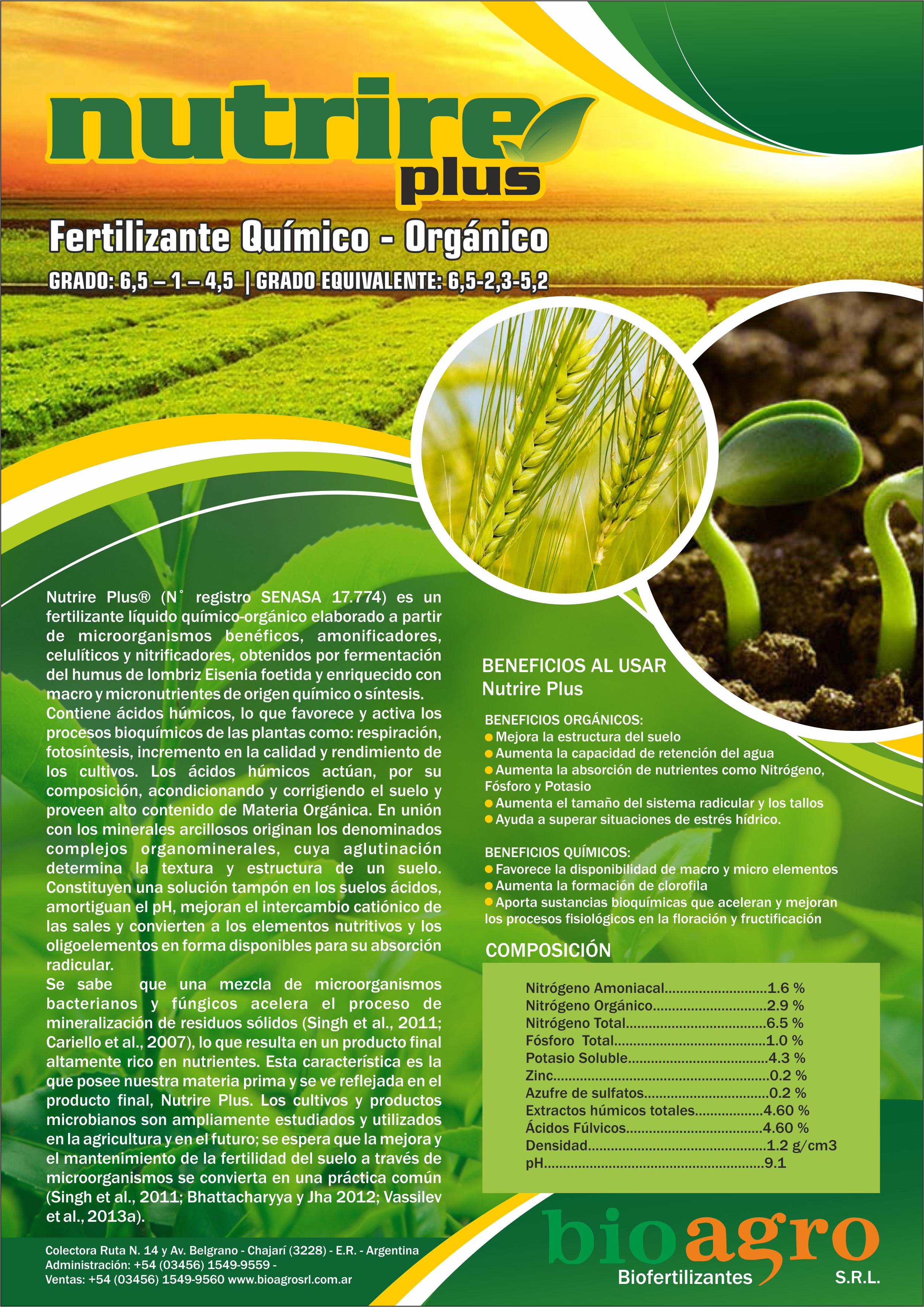 Bio agro es una empresa dedicada a fabricar un fertilizante liquido químico orgánico elaborado a partir de microorganismos benéficos, amonificadores, celuliticos y nitrificadores, obtenidos por fermentación del humus de lombriz Eisenia foetida y enriquecido con macro y micronutrientes de origen químico o síntesis. Contiene ácidos humicos, lo que favorece y activa los procesos bioquímicos de las plantas como : respiración, fotosíntesis , incremento en la calidad y rendimiento de los cultivos. Los ácidos humicos actúan por su composición ,acondicionando y corrigiendo el suelo y proveen alto contenido de materia orgánica . En unión con los minerales arcillosos originan los denominados complejos organominerales, cuya aglutinación determina la textura y estructura de un suelo . Constituye una solución tampon en los suelos ácidos, amortiguan el ph, mejoran el intercambio cationico de las sales y convierten a los elementos nutritivos y los oligoelementos en forma disponibles para su absorción radicular. Los beneficios al usar este producto son: Beneficios orgánicos: mejora la estructura del suelo, aumenta la capacidad de retención del agua, aumenta la absorción de nutrientes como Nitrogeno, fósforo y potasio, aumenta el tamaño del sistema radicular y los tallos, ayuda a superar situaciones de estrés hidrico. Beneficios químicos: favorece la disponibilidad de macro y micro elementos, aumenta la formación de clorofila, aporta sustancias bioquimicas que aceleran y mejoran los procesos fisiológicos en la floración y frutificacion. Composición : Nitrógeno amoniacal , nitrógeno orqanico, nitrógeno, fósforo, potasio, zinc, azufre de sulfatos,extractos humicos, ácidos fulvicos, densidad, ph.