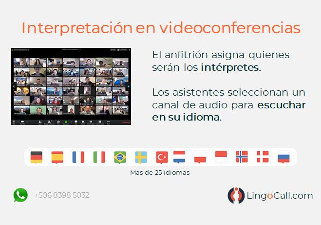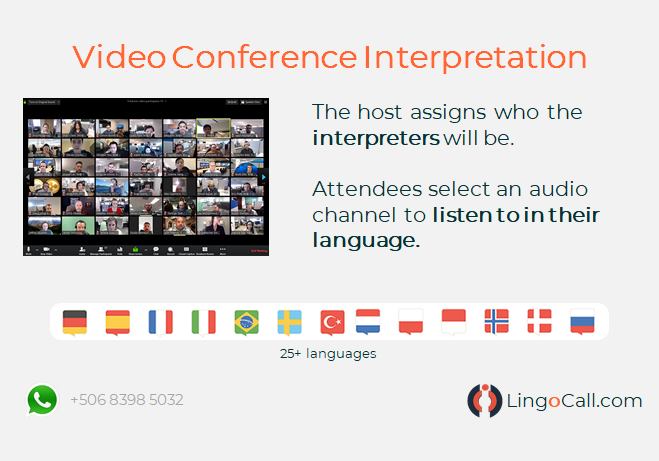 English Description: Video Conference Interpretation. The host assigns who the interpreters will be. Attendees select an audio channel to listen to in their language. More than 25 languages. Descripción en Español: Interpretación en videoconferencias. El anfitrión asigna quienes serán los intérpretes. Los asistentes seleccionan un canal de audio para escuchar en su idioma. Más de 25 idiomas www.lingocall.com WhatsApp + 506-8398-5032 info@lingocall.com