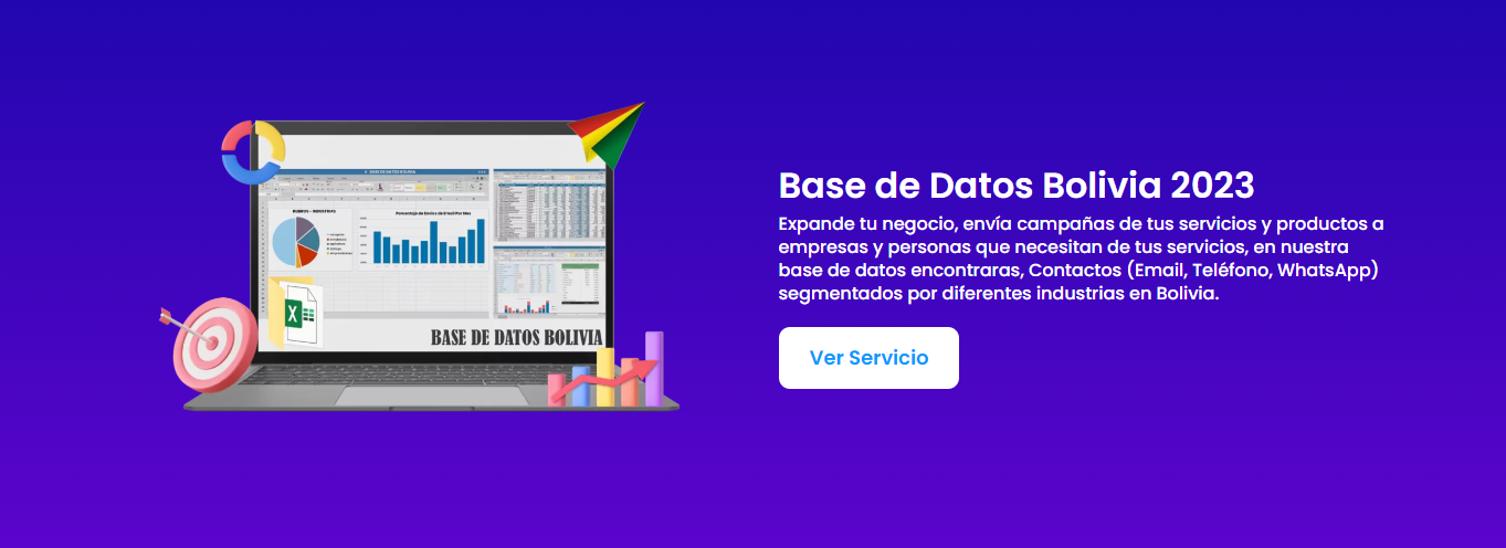 Bienvenidos a NetworkingBolivia, donde la creatividad y la innovación se unen para crear experiencias sorprendentes y funcionales, te brindamos nuestras mejores soluciones digitales, que te ayudaran a crecer no importa el tamaño de tu empresa, tenemos el talento y las herramientas para lograrlo. ********Somos Networkingbolivia, legalmente establecidos en Bolivia, estamos para brindar soluciones digitales y soluciones informáticas a todas aquellas empresas sin importar la industria, que aún siguen teniendo la dificultad de mostrarse en el Mundo Digital, nuestro objetivo es alcanzar su máximo potencial en internet y en todas las plataformas de redes sociales. ********Nuestro equipo Digital de expertos formados por profesionales altamente calificados en el campo del marketing digital, diseño y desarrollo web, estrategias en redes sociales y en el desarrollo de contenidos, quienes trabajan incansablemente para ofrecer soluciones creativas y efectivas a nuestros clientes. ********Somos el equipo de Marketing más completo y estamos Certificados por las Mejores Marcas del Mundo. ********Nuestras SolucionesProyectamos todas tus Ideas en Éxitos, Desarrollamos Estrategias Digitales para Potenciar tu Empresa tu Marca en el Mundo Digital. *******Marketing Digital Desarrollamos estrategias digitales a tu medida, enfocadas en el crecimiento de tu marca, tu negocio, tu empresa. Deja a un lado las dificultades y complicaciones y concentrémonos en hacer crecer tu negocio. ********Gestión de Redes SocialesNuestro Objetivo Principal es impulsar tu Marca tu Negocio, y lograr el posicionamiento más Alto, por nuestros estrategas de Marketing en Redes Sociales, incrementaremos clientes interesados en tus productos o servicios, forma parte de nuestros casos de éxitos. ********Diseño y Desarrollo Web Convertimos tus ideas en historias de éxitos, diseñamos páginas webs que inspiran, y se adapten a cualquier tipo de dispositivos de la actualidad, NetworkingBolivia diseña, crea y desarrolla la sucursal digital de tu empresa (tu sitio web) para que puedas generar oportunidades de negocios con tu sitio web profesional. ********Email Marketing Atomatizado ¡Llega directo al corazón de tu audiencia con nuestra poderosa estrategia de Email Marketing! En nuestra agencia de marketing, entendemos la importancia de cada mensaje que enviamos y nos enfocamos en generar resultados tangibles para tu negocio. ********Base de Datos Bolivia 2024 Expande tu negocio, envía campañas de tus servicios y productos a empresas y personas que necesitan de tus servicios, en nuestra base de datos encontraras, Contactos (Email, Teléfono, WhatsApp) segmentados por diferentes industrias en Bolivia. ********Web Hosting Dominio Web ¡Tu presencia en línea comienza aquí! Con nuestro servicio de Web Hosting y Dominio Web, tu sitio web estará en las mejores manos. ¿Por qué elegir nuestro Web Hosting y Dominio Web? En el mundo digital, la estabilidad y la velocidad son fundamentales para el éxito en línea. Nuestra plataforma de Web Hosting y Dominio Web ofrece un rendimiento excepcional, seguridad de primer nivel y un servicio al cliente dedicado para que puedas concentrarte en hacer crecer tu negocio. ********Soluciones Informáticas Mantenimiento Informático (Hardware, Software).Cableado Estructurado, Conectividad y Redes de Datos, Recuperación de Datos, Softwares (Antivirus, Office 365, Windows, Windows Server), Soporte TI. ********¿Nuestro principal objetivo? Impulsar el crecimiento de tu Negocio sin importar el rubro de tu marca. Creamos Proyectos y campañas avanzadas orientadas a hacer crecer tu negocio, logrando generar resultados de alto impacto, gracias a nuestros talentos, estrategias y habilidades de nuestro Equipo Digital.
