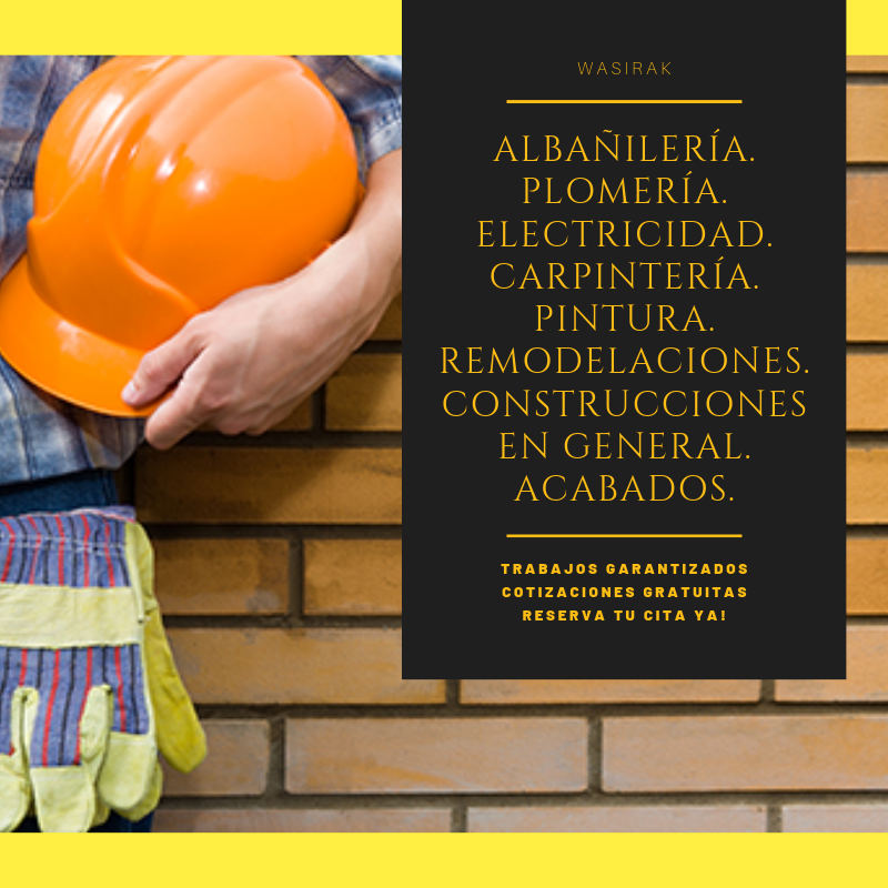 Wasirak Construcciones, es una empresa de construcción, reparación y mantenimiento de hogares, oficinas y más, que ofrece un servicio íntegro en construcciones en general y soluciones para el hogar referente a plomería, albañilería, electricidad, carpintería, lectura de planos, estructuras metálicas, tumbados, y todo lo relacionado al sector de la construcción. Todos nuestros servicios incluyen asesoramiento personalizado.