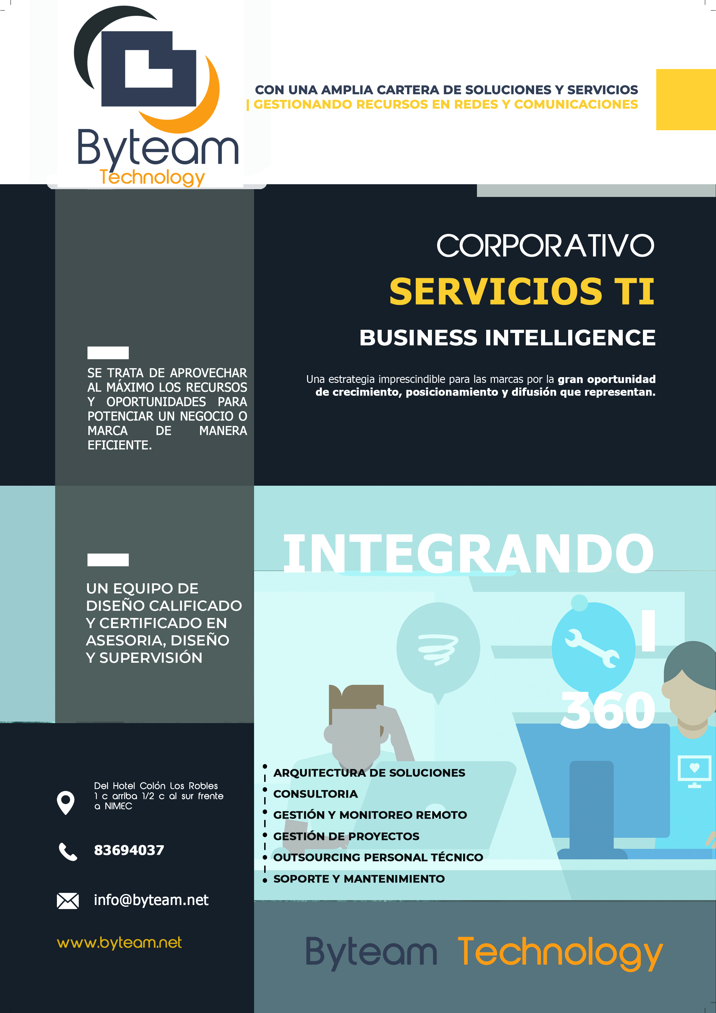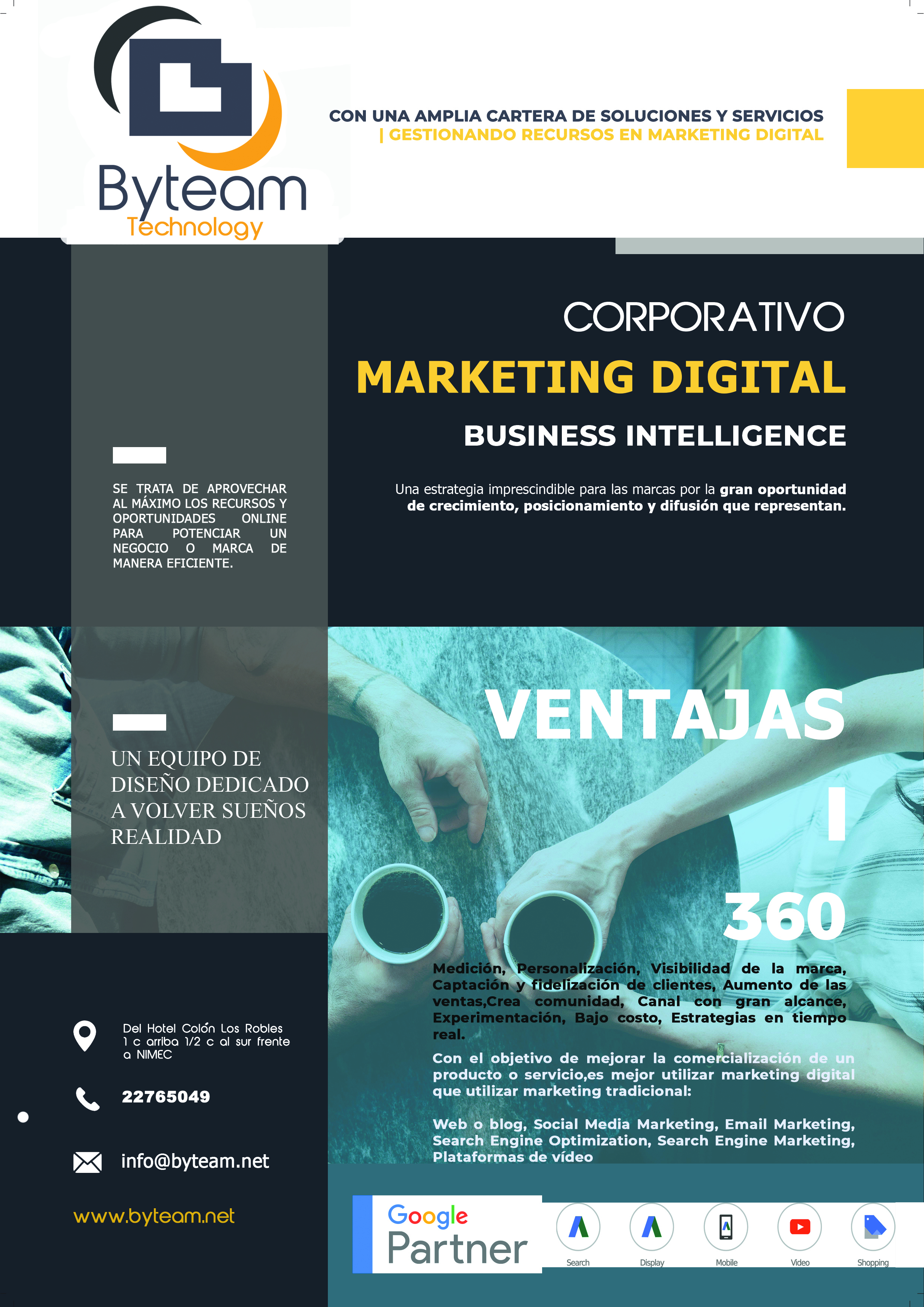 Es una empresa que ofrece equipo soluciones y servicios tecnológicos de marcas lideres en el mundo a Nicaragua,integrando Marketing Digital con certificación mundial con Google Partner y Facebook Badge partner