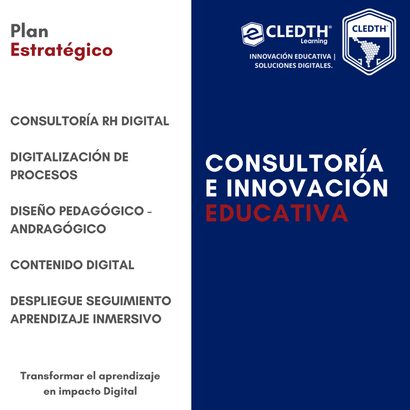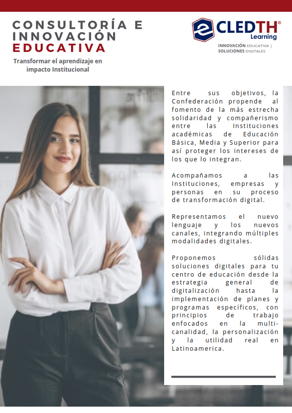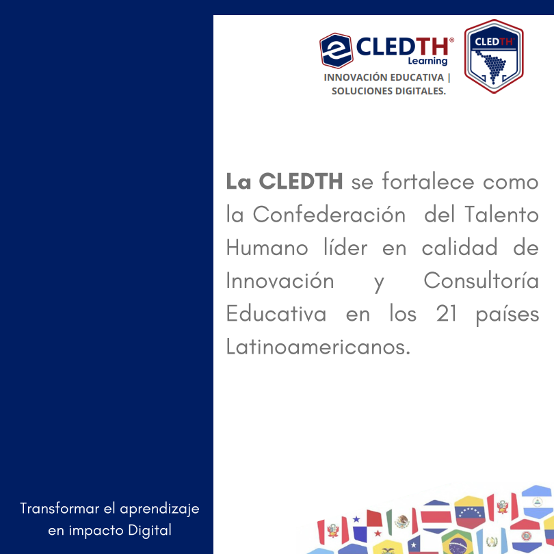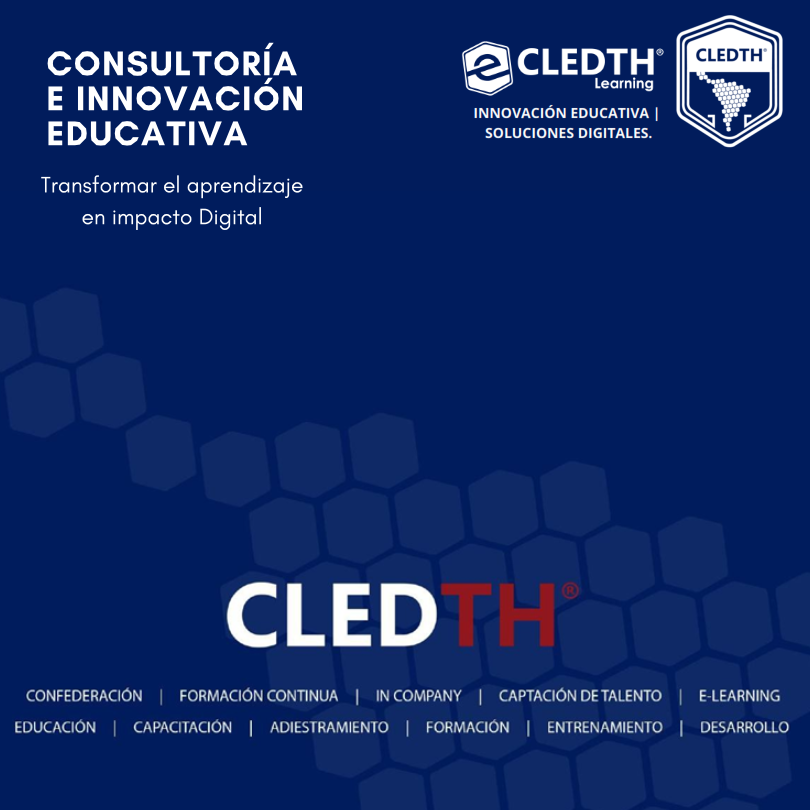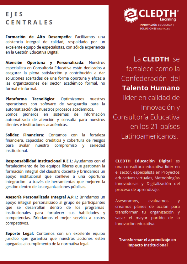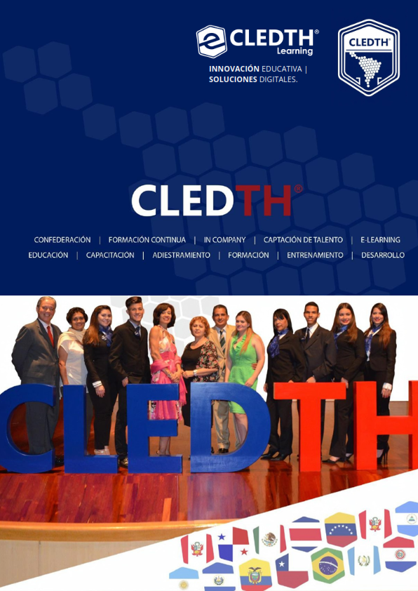 CONFEDERACIÓN LATINOAMERICANA DE ESTUDIOS PARA EL DESARROLLO DEL TALENTO HUMANO, CLEDTH. Representa la mejor opción para impulsar el perfeccionamiento del Talento Humano, con apego a los valores como guías de actuación; incorporando elementos de carácter profesional en los diversos procesos de gestión del Recurso Humano e impulsando el desarrollo de programas académicos informal, formal y no formal en EDUCACIÓN CONTINUA VIRTUAL, A DISTANCIA, PRESENCIAL O DE MODALIDAD MIXTA, a fin de satisfacer las necesidades profesionales de los hombres y mujeres que día a día se retan para acompasarse con los avances científicos y tecnológicos que impactan en las organizaciones, empresas, universidades e instituciones educativas públicas y privadas en Latinoamérica, así como en contextos globales. Acerca de la CLEDTH: Fusiona la integración del talento humano, la educación, la cultura y la innovación con la docencia e Investigación, como un modelo de gestión del conocimiento para lograr la coyuntura con entes gubernamentales, organismos no gubernamentales, y la sociedad en general; a fin de promover el desarrollo de planes, programas y proyectos que coadyuven con la calidad de vida en la región y favorezcan “el saber conocer, el saber ser y el saber hacer” de los hombres y mujeres que integran las distintas comunidades en Latinoamérica. En LATINOAMÉRICA Trabajamos incesantemente para impulsar su reconocimiento tanto en contextos nacionales así como internacionales, proporcionando un apoyo continuo a instituciones formativa, estableciendo nuevas alianzas para la consolidación del desarrollo del talento humano a través de las redes educacionales. El valor agregado de la CLEDTH, es la certificación internacional de sus programas validados por los países miembros latinoamericanos en las distintas instituciones públicas y privadas. NUESTROS PROGRAMAS El claustro de la CLEDTH está conformado por docentes, especialistas, certificados y con un alto reconocimiento académico, lo que permite que los alumnos puedan adquirir conocimientos y habilidades totalmente actualizadas con las últimas tendencias y herramientas tecnológicas. *VISIÓN* Ser una organización de referencia en educación, cultura e innovación, como modelo de capacitación, desarrollo adiestramiento y actualización del talento humano dentro de los contextos sociales, éticos, profesionales y místicos vinculados con los supremos intereses en Latinoamérica reconocida por las distintas instituciones del Estado, universidades organizaciones entidades y las comunidades en la región. PASIÓN POR EL TALENTO | PARTNERS DEL MUNDO EMPRESARIAL La Pasión de la Confederación Latinoamericana de Estudios para el Desarrollo del Talento Humano, es Creer, Querer y Formar al Talento; trabajaremos en el desarrollo de estrategias de relaciones interinstitucionales a fin de apalancar en la globalización nuestro aporte educativo. Nos apasiona visionar, educar y entregar toda sapiencia al talento por venir. ¿POR QUÉ LA CLEDTH?. Nuestra formación corporativa reúne los aspectos clave para el desarrollo competitivo de cualquier organización: contenidos rigurosos y de calidad impartidos por reconocidos docentes y especialista de la CLEDTH. Metodología innovadora, participativa, dinámica y excelencia pedagógica y andragógica que aplicamos tanto en la creación de materiales, como en la docencia y las aulas. Flexibilidad de formatos, programa de educación continua y cursos de especialización, congresos, jornadas y talleres, de modalidades (Presencial, Virtual y Mixta). Aplicabilidad práctica de todas las propuestas para que sea posible la transferencia al puesto de trabajo y la vinculación con la organización.