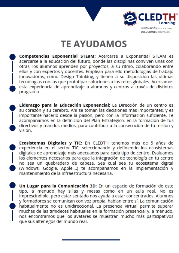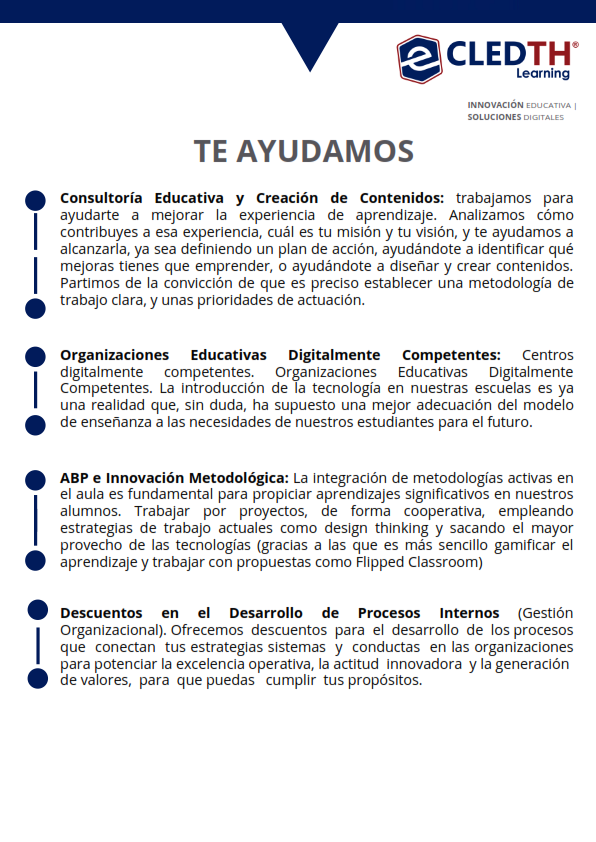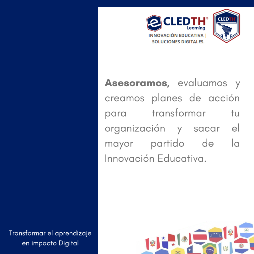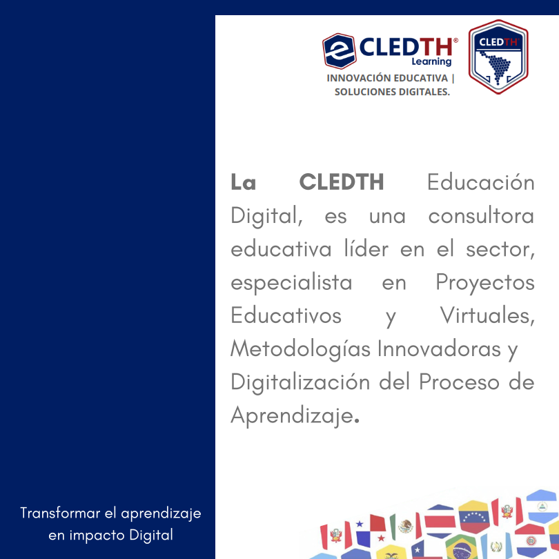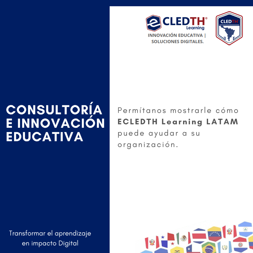 CONFEDERACIÓN LATINOAMERICANA DE ESTUDIOS PARA EL DESARROLLO DEL TALENTO HUMANO, CLEDTH. Representa la mejor opción para impulsar el perfeccionamiento del Talento Humano, con apego a los valores como guías de actuación; incorporando elementos de carácter profesional en los diversos procesos de gestión del Recurso Humano e impulsando el desarrollo de programas académicos informal, formal y no formal en EDUCACIÓN CONTINUA VIRTUAL, A DISTANCIA, PRESENCIAL O DE MODALIDAD MIXTA, a fin de satisfacer las necesidades profesionales de los hombres y mujeres que día a día se retan para acompasarse con los avances científicos y tecnológicos que impactan en las organizaciones, empresas, universidades e instituciones educativas públicas y privadas en Latinoamérica, así como en contextos globales. Acerca de la CLEDTH: Fusiona la integración del talento humano, la educación, la cultura y la innovación con la docencia e Investigación, como un modelo de gestión del conocimiento para lograr la coyuntura con entes gubernamentales, organismos no gubernamentales, y la sociedad en general; a fin de promover el desarrollo de planes, programas y proyectos que coadyuven con la calidad de vida en la región y favorezcan “el saber conocer, el saber ser y el saber hacer” de los hombres y mujeres que integran las distintas comunidades en Latinoamérica. En LATINOAMÉRICA Trabajamos incesantemente para impulsar su reconocimiento tanto en contextos nacionales así como internacionales, proporcionando un apoyo continuo a instituciones formativa, estableciendo nuevas alianzas para la consolidación del desarrollo del talento humano a través de las redes educacionales. El valor agregado de la CLEDTH, es la certificación internacional de sus programas validados por los países miembros latinoamericanos en las distintas instituciones públicas y privadas. NUESTROS PROGRAMAS El claustro de la CLEDTH está conformado por docentes, especialistas, certificados y con un alto reconocimiento académico, lo que permite que los alumnos puedan adquirir conocimientos y habilidades totalmente actualizadas con las últimas tendencias y herramientas tecnológicas. *VISIÓN* Ser una organización de referencia en educación, cultura e innovación, como modelo de capacitación, desarrollo adiestramiento y actualización del talento humano dentro de los contextos sociales, éticos, profesionales y místicos vinculados con los supremos intereses en Latinoamérica reconocida por las distintas instituciones del Estado, universidades organizaciones entidades y las comunidades en la región. PASIÓN POR EL TALENTO | PARTNERS DEL MUNDO EMPRESARIAL La Pasión de la Confederación Latinoamericana de Estudios para el Desarrollo del Talento Humano, es Creer, Querer y Formar al Talento; trabajaremos en el desarrollo de estrategias de relaciones interinstitucionales a fin de apalancar en la globalización nuestro aporte educativo. Nos apasiona visionar, educar y entregar toda sapiencia al talento por venir. ¿POR QUÉ LA CLEDTH?. Nuestra formación corporativa reúne los aspectos clave para el desarrollo competitivo de cualquier organización: contenidos rigurosos y de calidad impartidos por reconocidos docentes y especialista de la CLEDTH. Metodología innovadora, participativa, dinámica y excelencia pedagógica y andragógica que aplicamos tanto en la creación de materiales, como en la docencia y las aulas. Flexibilidad de formatos, programa de educación continua y cursos de especialización, congresos, jornadas y talleres, de modalidades (Presencial, Virtual y Mixta). Aplicabilidad práctica de todas las propuestas para que sea posible la transferencia al puesto de trabajo y la vinculación con la organización.