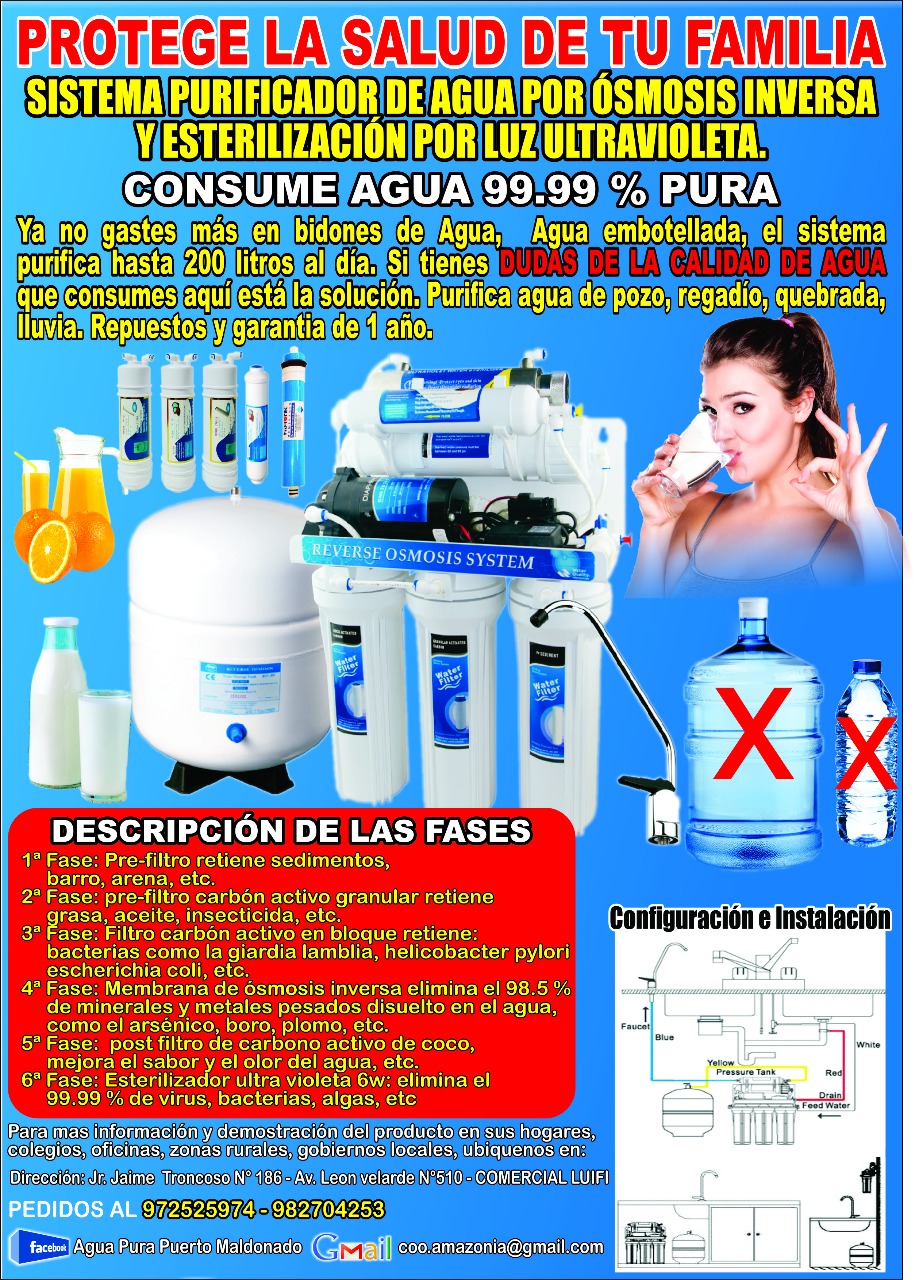 Comercializamos productos para PURIFICAR AGUA de distintas fuentes y calidades , en zonas urbanas y zonas rurales. Estamos preocupados por la calidad de agua que consumen, los niños, ancianos y pobladores en zonas de alta contaminación mineral, etc. Queremos contribuir a la conservación del medio ambiente.