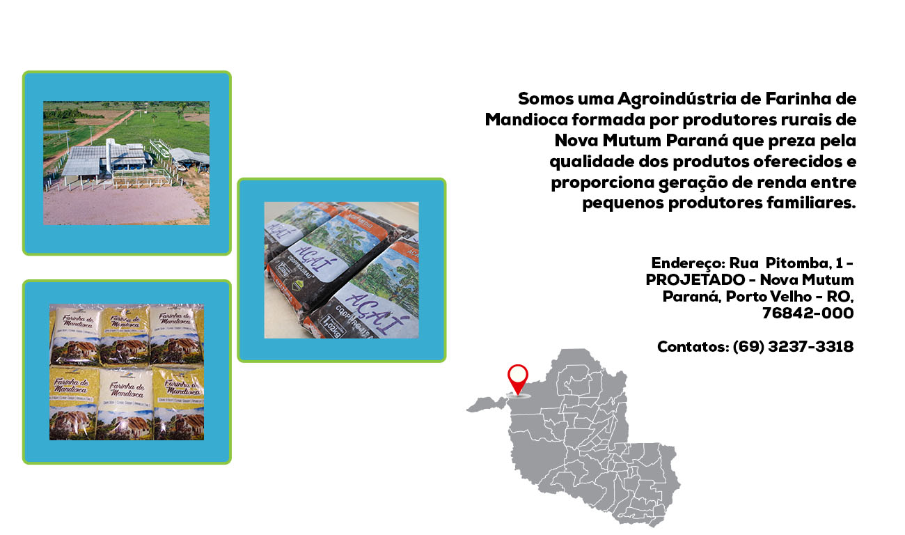 Cooperativa de Produtores Rurais: - Serviços de Reflorestamento na Amazônia; - Comercialização de Polpa de Açaí; - Comercialização de Farinha de Mandioca; - Comercialização de Amido de Mandioca; - Comercialização de Castanhas; - Serviço de Coleta de Sementes Nativas da Amazônia; - Serviço de Plantio de Mudas; - Serviço de Consultoria Ambiental na Amazônia;