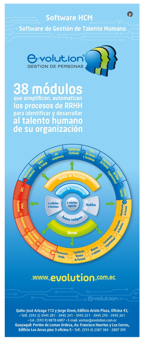 Software development. Software with several modules to manage Human Talent and the role of payments. Aligned to the Strategy of the company. Performs performance evaluation, payroll budget, staff selection, holiday control, schedule control, work environment, industrial safety, self-service.