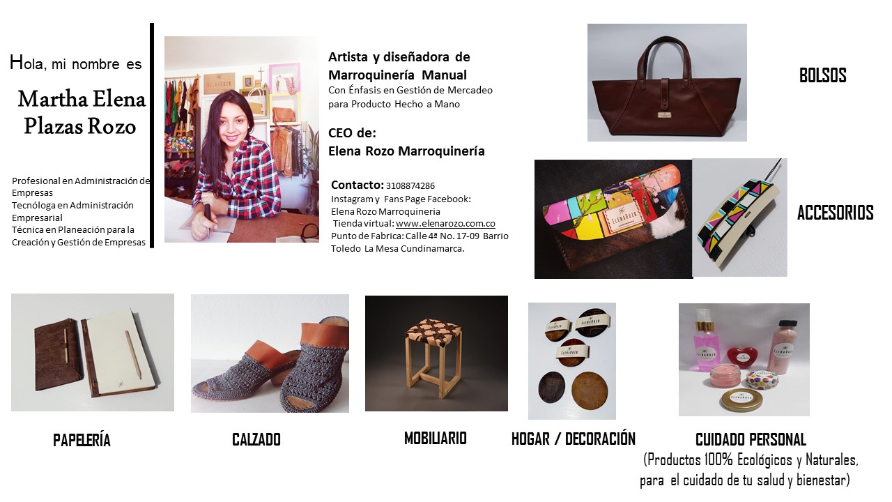 Diseñamos y fabricamos productos de moda y decoración para diferentes estilos de personas y hogares, en Cuero 100% Manual, de impacto ambiental, artístico, étnico y cultural, que nos permite entregar un producto con identidad e historia colombiana, con el propósito de recuperar la pasión por el OFICIO DEL CUERO, la transformación de la materia prima y el trabajo HECHO A MANO, exponiendo la innovación y las tendencias de moda. También contamos con una linea de Restauración, Nuestro lema es no dejes en el pasado lo que alguna vez significo para ti. Visita nuestro Instagram: @elena_rozo_marroquineria