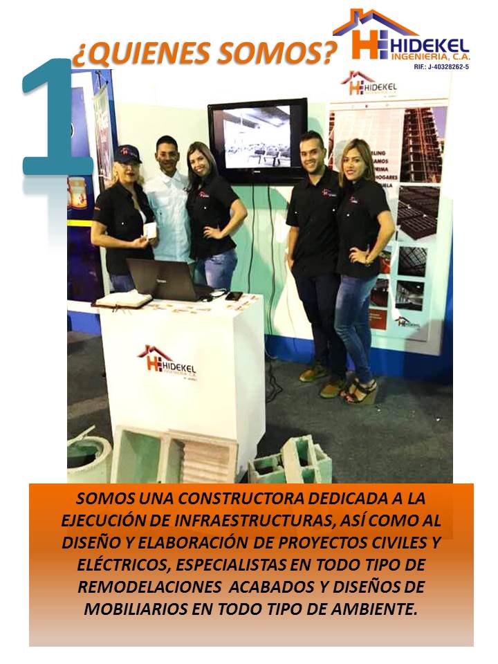 HIDEKEL INGENIERIA C.A Somos una constructora dedicada a la ejecución de infraestructuras, así como al diseño y elaboración de proyectos civiles y eléctricos, especialistas en todo tipo de remodelaciones acabados y diseños de mobiliarios en todo tipo de ambiente. Tenemos los conocimientos y una amplia experiencia profesional para el desarrollo de cualquier proyecto en el área civil y eléctrica. Contamos con un excelente equipo de profesionales capacitados para responder a sus necesidades, en cuanto a calidad de atención, eficiente ejecución de obras con un alto nivel de compromiso y responsabilidad. Ofrecemos una variedad de servicios como la elaboración y ejecución de proyectos de construcción y mantenimiento de: Obras civiles, hidráulicas, eléctricas, mecánicas, construcción de edificaciones, vialidad urbana y rural, acueductos, cálculos, avalúos e inspección de los mismos tipos de proyectos, elaboración de planos y cálculos estructurales, la promoción y desarrollo de programas urbanísticos y de vivienda de interés social o de cualquier otra naturaleza, instalación y mantenimiento de equipos de aire acondicionado industrial o comercial, iluminación de alumbrado público, mantenimiento e instalaciones de líneas y redes telefónicas, inspección de obras civiles, eléctricas, hidráulicas y mecánicas, tendidos de líneas eléctricas de distribución, fabricación, instalación y mantenimiento de estaciones y subestaciones, centro de transformación, centrales eléctricas, evaluación y equilibrio de carga, distribución de energía eléctrica. La importación, exportación, venta, distribución y comercialización de materiales para la construcción y de ferretería, kit de construcción,fabricamos bloques de cemento y adoquines, distribuimos herramientas y materia prima, materiales de carpintería y ebanistería igualmente en lo que se refiere a todo tipo de baldosas, cerámicas y piezas sanitarias. Elaboración, análisis y preparación de cómputos, planos valuaciones, y análisis de costo de precios. PROYECTOS Y EJECUCIÓN • Diseño de interiores. • Proyectos, ejecución y remodelación de obras civiles y eléctricas. • Proyecto en el área de distribución eléctrica de urbanismo • Proyectos y ejecución en instalaciones eléctricas en el área de climatización. PRESTAMOS SERVICIOS • Realizamos acabados de áreas comunes y privadas • Análisis del entorno físico disponible. • Adaptar las oficinas a la estructura de la organización. • Elaboración del anteproyecto. • Elaboración del proyecto final. SELECCIÓN DE LOS ACABADOS • Adecuación de los servicios y obra civil. Construcción de Cunetas, canales, alcantarillas, colectores, entre otros. Construcción de acera, brocales y asfaltamos vialidades. Instalación de tuberías de aguas blancas, aguas negras y fluviales, Acabado de edificios estuco Friso y pintura. Instalación y mantenimiento de aire acondicionado, chiller. Instalación y mantenimiento de plantas eléctricas. Instalación de Puertas y Ventana. • Instalación del mobiliario.