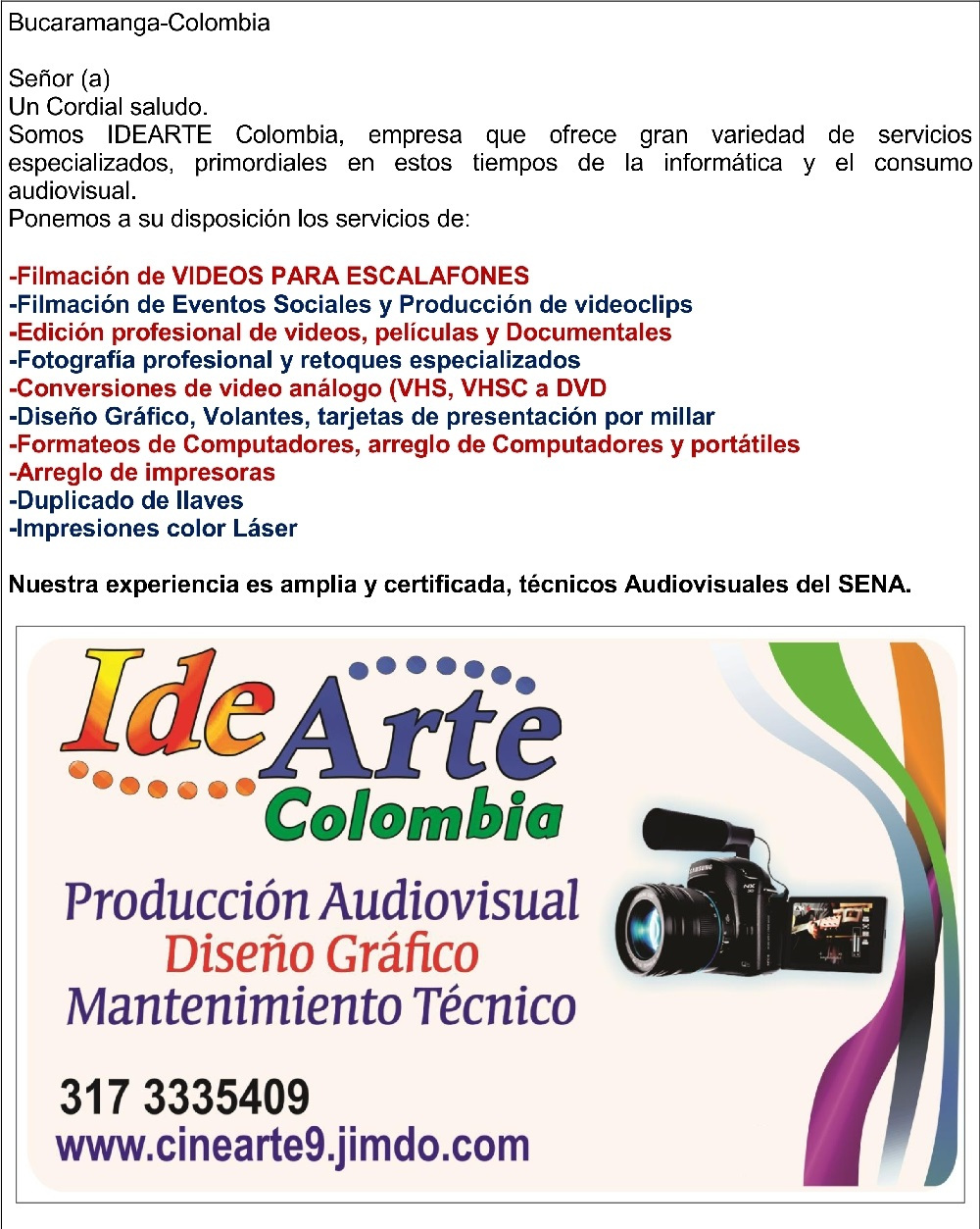 Somos IDEARTE PRODUCCIONES SAS, una empresa creada con la intención de brindar soluciones eficaces y necesarias para las tareas integrales de Diseño gráfico, fotografía, Producción Audiovisuales, Servicios de impresión, mantenimiento de Computadores y demás afines dentro del campo local y regional. Nuestro principal objetivo es la satisfacción personalizada con el cliente, permitiendo una interacción constructiva, realizando todo trabajo con la máxima calidad y estética profesional.