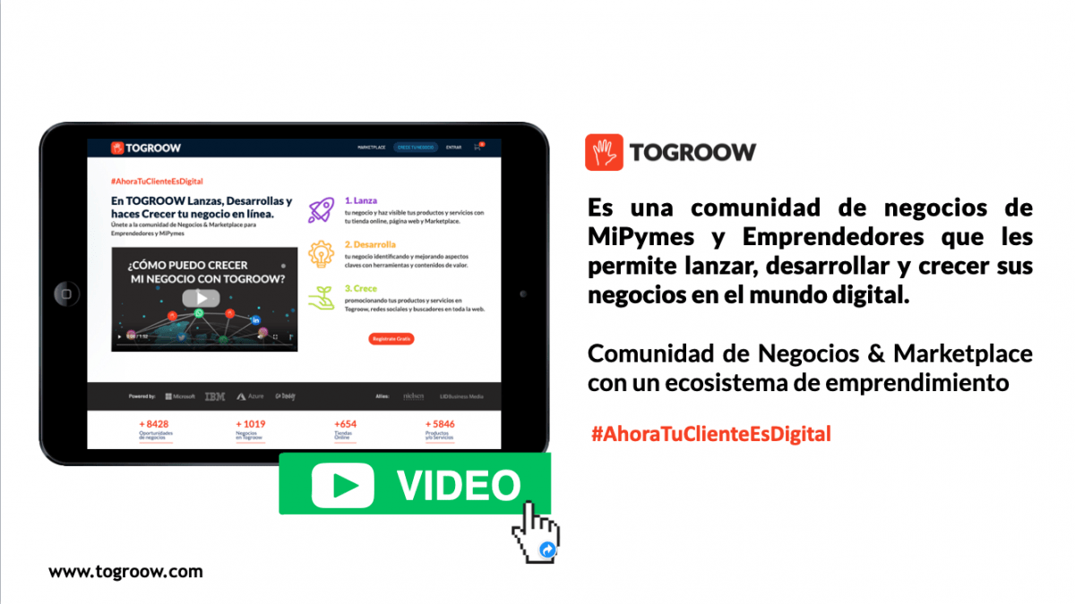 Togroow.com es la Comunidad de Negocios & Marketplace con ecosistema de emprendimiento, para Emprendedores y MiPymes que Lanza, Desarrolla y Crece tu negocio en la Web.